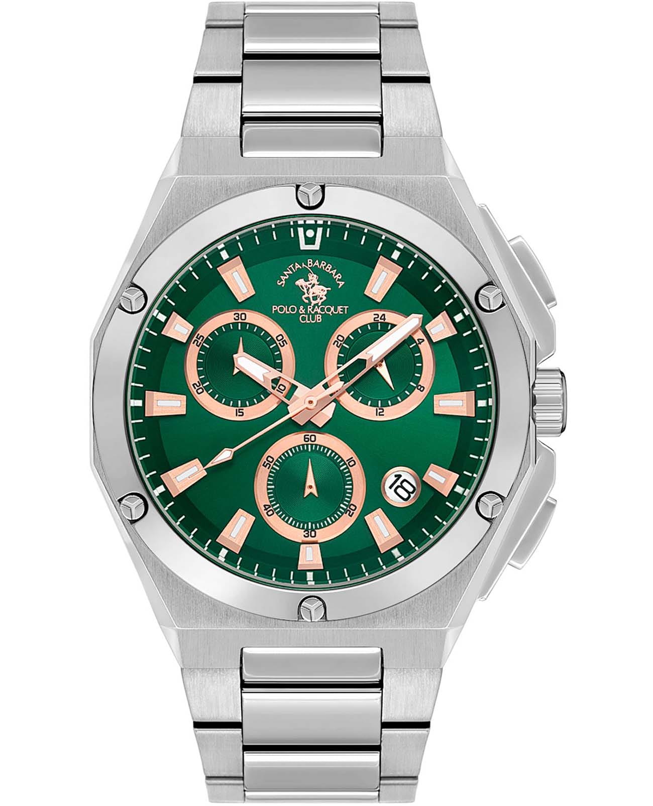 Santa Barbara Polo & Racquet Club Prive SB.1.10577-3 — стильные мужские часы-хронограф, сочетающие спортивную динамику и функциональность. Крупный корпус выполнен из нержавеющей стали 316L и гармонично дополнен браслетом на раскладной застёжкеРаскладная застёжкаТакой тип застёжки используется только на браслетах из металла. Она никогда не раскрывается полностью, происходит разделение на 2 и более частей. Раскладывающая застёжка снизит вероятность потери часов к минимуму.. Циферблат с акцентными метками и стрелками с люминесцентным покрытиемЛюминесцентное покрытиеПозволяет считывать показания времени в темноте. Производители наносят на стрелки, часовые индексы, безель или поверхность циферблата светонакопительный состав, дающий холодное свечение. оформлен в многослойной структуре и оснащён вспомогательными индикаторами, включая хронографХронографФункция позволяет измерять отрезки времени с особой точностью: часы, минуты, секунды. Верным признаком хронографа является наличие на циферблате 3 дополнительных окошек-счётчиков., 24-часовой формат времени. В нижней части расположено окошко даты, что делает модель ещё более практичной. Минеральное стеклоМинеральное стеклоМинеральное стекло представляет собой искусственно выращенный минерал кварца. Такое стекло отличается особой устойчивостью к повреждениям и царапинам. Уступает по некоторым качествам сапфировому стеклу. защищает циферблат от царапин, а кварцевый механизм обеспечивает высокую точность. Водонепроницаемость 50 метров позволит защитить корпус от случайных брызг или капель дождя. Благодаря своей универсальной эстетике эти часы уместны и в деловой среде, и в повседневном образе.