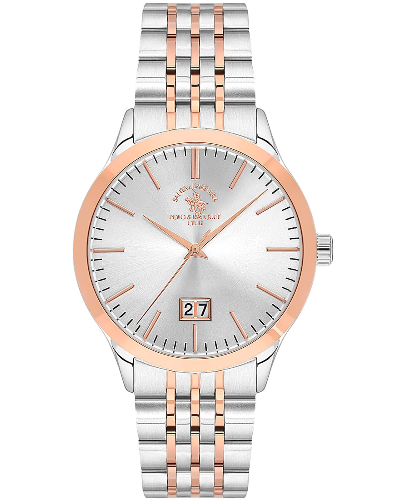 Мужские кварцевые Santa Barbara Polo & Racquet Club SB.1.10588-5 — воплощение элегантности и технического совершенства. Корпус из нержавеющей стали серебристого цвета, диаметром 40 мм, что делает их устойчивыми к внешним воздействиям и придает благородный вид. Изящный циферблат защищён минеральным стекломМинеральное стеклоМинеральное стекло представляет собой искусственно выращенный минерал кварца. Такое стекло отличается особой устойчивостью к повреждениям и царапинам. Уступает по некоторым качествам сапфировому стеклу., устойчивое к царапинам и механическим повреждениям. Браслет из стали с частичным IP-покрытиемIP-покрытиеМетод ионного напыления. Демонстрирует повышенную устойчивость к истиранию, окислению и химическим веществам. Под воздействием высокого давления и температуры около 1500°C молекулы металла надёжно соединяются с частицами корпуса часов. на застёжке-бабочке с кнопкамиЗастёжка "бабочка"Такой вид застёжки дополняется предохранителями, помогающими избежать случайного раскрытия браслета. Обладают изящным исполнением. обеспечивает комфортное и безопасное ношение. Окошко даты находится в положении 6 часов. Декоративный безельБезельВнешний ободок, закрепляющий стекло. В спортивных часах так называется поворотное кольцо с делениями на циферблате, выполняет роль таймера – замеряет отрезки времени на шкале. Неподвижный безель – элемент декора. Однонаправленно вращающийся безель на дайверских часах позволяет фиксировать моменты погружения и выныривания на поверхность. с IP-покрытиемIP-покрытиеМетод ионного напыления. Демонстрирует повышенную устойчивость к истиранию, окислению и химическим веществам. Под воздействием высокого давления и температуры около 1500°C молекулы металла надёжно соединяются с частицами корпуса часов. цвета розового золота. Водонепроницаемость 50 метров позволит защитить корпус от случайных брызг или капель дождя. Идеальный выбор для тех, кто ценит элегантный дизайн и качество.