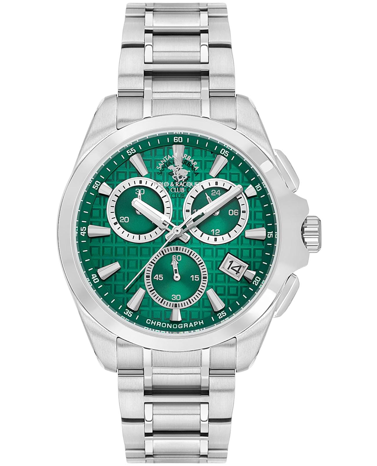 Мужские кварцевые часы-хронографХронографФункция позволяет измерять отрезки времени с особой точностью: часы, минуты, секунды. Верным признаком хронографа является наличие на циферблате 3 дополнительных окошек-счётчиков. с секундомеромСекундомерСекундоме́р — прибор, способный измерять интервалы времени с точностью до долей секунды. Santa Barbara Polo & Racquet Club SB.1.10591-5 — воплощение элегантности и технического совершенства. Корпус из нержавеющей стали серебристого цвета, диаметром 43 мм, что делает их устойчивыми к внешним воздействиям и придает благородный вид. Стрелки и метки с люминесцентным покрытиемЛюминесцентное покрытиеПозволяет считывать показания времени в темноте. Производители наносят на стрелки, часовые индексы, безель или поверхность циферблата светонакопительный состав, дающий холодное свечение., обеспечивающим хорошую читаемость в темноте. Циферблат защищён минеральным стекломМинеральное стеклоМинеральное стекло представляет собой искусственно выращенный минерал кварца. Такое стекло отличается особой устойчивостью к повреждениям и царапинам. Уступает по некоторым качествам сапфировому стеклу. устойчивое к царапинам и механическим повреждениям. 12-ти и 24-х часовой формат времени. Окошко даты находится в положении 4 часа. Фактурный циферблат с квадратными ячейками, украшен фирменным логотипом. Накладные метки в виде штрихов. Стальной браслет на раскладной застёжке с фиксаторомРаскладная застёжкаТакой тип застёжки используется только на браслетах из металла. Она никогда не раскрывается полностью, происходит разделение на 2 и более частей. Раскладывающая застёжка снизит вероятность потери часов к минимуму. обеспечивает комфортное и безопасное ношение. Водонепроницаемость 50 метров позволит защитить корпус от случайных брызг или капель дождя. Идеальный выбор для тех, кто ценит элегантный дизайн и качество.