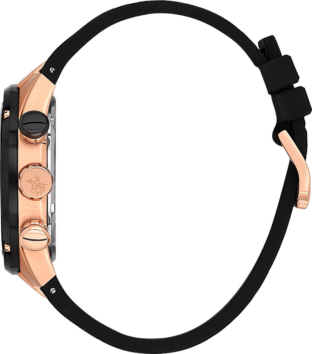Мужские кварцевые часы-хронографХронографФункция позволяет измерять отрезки времени с особой точностью: часы, минуты, секунды. Верным признаком хронографа является наличие на циферблате 3 дополнительных окошек-счётчиков. с секундомеромСекундомерСекундоме́р — прибор, способный измерять интервалы времени с точностью до долей секунды. Santa Barbara Polo & Racquet Club SB.3.10001-1 — воплощение элегантности и технического совершенства. Корпус из нержавеющей стали с IP-покрытиемIP-покрытиеМетод ионного напыления. Демонстрирует повышенную устойчивость к истиранию, окислению и химическим веществам. Под воздействием высокого давления и температуры около 1500°C молекулы металла надёжно соединяются с частицами корпуса часов. цвета розового золота, диаметром 45 мм, что делает их устойчивыми к внешним воздействиям и придает благородный вид. Стрелки и метки с люминесцентным покрытиемЛюминесцентное покрытиеПозволяет считывать показания времени в темноте. Производители наносят на стрелки, часовые индексы, безель или поверхность циферблата светонакопительный состав, дающий холодное свечение., обеспечивающим хорошую читаемость в темноте. Неподвижный безельБезельВнешний ободок, закрепляющий стекло. В спортивных часах так называется поворотное кольцо с делениями на циферблате, выполняет роль таймера – замеряет отрезки времени на шкале. Неподвижный безель – элемент декора. Однонаправленно вращающийся безель на дайверских часах позволяет фиксировать моменты погружения и выныривания на поверхность. с IP-покрытиемIP-покрытиеМетод ионного напыления. Демонстрирует повышенную устойчивость к истиранию, окислению и химическим веществам. Под воздействием высокого давления и температуры около 1500°C молекулы металла надёжно соединяются с частицами корпуса часов. черного цвета. Циферблат защищён минеральным стекломМинеральное стеклоМинеральное стекло представляет собой искусственно выращенный минерал кварца. Такое стекло отличается особой устойчивостью к повреждениям и царапинам. Уступает по некоторым качествам сапфировому стеклу. устойчивое к царапинам и механическим повреждениям. Окошко даты находится в положении 4 часа, тахиметрТахиметрРазмеченная шкала, располагается на ободке или безеле часов. Тахиметр позволяет рассчитать скорость на определённом участке пути, расстояние измеряется в километрах или милях. по внешнему краю. Кожаный ремешок на стандартной застёжке обеспечивает комфортное и безопасное ношение. Водонепроницаемость 100 метров позволит плавать, нырять и заниматься другими водными видами спорта. Идеальный выбор для тех, кто ценит элегантный дизайн и качество.