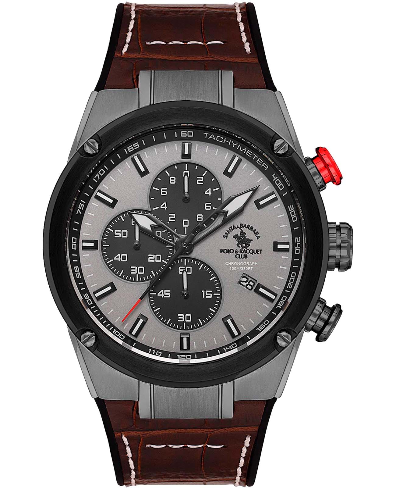 Мужские кварцевые часы-хронографХронографФункция позволяет измерять отрезки времени с особой точностью: часы, минуты, секунды. Верным признаком хронографа является наличие на циферблате 3 дополнительных окошек-счётчиков. с секундомеромСекундомерСекундоме́р — прибор, способный измерять интервалы времени с точностью до долей секунды. Santa Barbara Polo & Racquet Club SB.3.10001-4 — воплощение элегантности и технического совершенства. Корпус из нержавеющей стали с IP-покрытиемIP-покрытиеМетод ионного напыления. Демонстрирует повышенную устойчивость к истиранию, окислению и химическим веществам. Под воздействием высокого давления и температуры около 1500°C молекулы металла надёжно соединяются с частицами корпуса часов. серого цвета, диаметром 45 мм, что делает их устойчивыми к внешним воздействиям и придает благородный вид. Стрелки и метки с люминесцентным покрытиемЛюминесцентное покрытиеПозволяет считывать показания времени в темноте. Производители наносят на стрелки, часовые индексы, безель или поверхность циферблата светонакопительный состав, дающий холодное свечение., обеспечивающим хорошую читаемость в темноте. Неподвижный безельБезельВнешний ободок, закрепляющий стекло. В спортивных часах так называется поворотное кольцо с делениями на циферблате, выполняет роль таймера – замеряет отрезки времени на шкале. Неподвижный безель – элемент декора. Однонаправленно вращающийся безель на дайверских часах позволяет фиксировать моменты погружения и выныривания на поверхность. с IP-покрытиемIP-покрытиеМетод ионного напыления. Демонстрирует повышенную устойчивость к истиранию, окислению и химическим веществам. Под воздействием высокого давления и температуры около 1500°C молекулы металла надёжно соединяются с частицами корпуса часов. черного цвета. Циферблат защищён минеральным стекломМинеральное стеклоМинеральное стекло представляет собой искусственно выращенный минерал кварца. Такое стекло отличается особой устойчивостью к повреждениям и царапинам. Уступает по некоторым качествам сапфировому стеклу. устойчивое к царапинам и механическим повреждениям. Окошко даты находится в положении 4 часа, тахиметрТахиметрРазмеченная шкала, располагается на ободке или безеле часов. Тахиметр позволяет рассчитать скорость на определённом участке пути, расстояние измеряется в километрах или милях. по внешнему краю. Кожаный ремешок на стандартной застёжке обеспечивает комфортное и безопасное ношение. Водонепроницаемость 100 метров позволит плавать, нырять и заниматься другими водными видами спорта. Идеальный выбор для тех, кто ценит элегантный дизайн и качество.