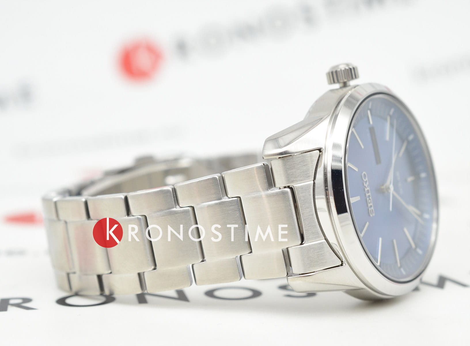 Seiko SNE525P1 — стильные мужские часы из коллекции Conceptual Series Dress, выполненные в универсальном классическом дизайне с современным акцентом. Корпус диаметром 41 мм изготовлен из нержавеющей стали с аккуратной сатинированной отделкой, а прочный браслет из того же материала дополнен раскладной застёжкойРаскладная застёжкаТакой тип застёжки используется только на браслетах из металла. Она никогда не раскрывается полностью, происходит разделение на 2 и более частей. Раскладывающая застёжка снизит вероятность потери часов к минимуму., обеспечивающей комфортное и надёжное ношение. В качестве защитного элемента используется минеральное стеклоМинеральное стеклоМинеральное стекло представляет собой искусственно выращенный минерал кварца. Такое стекло отличается особой устойчивостью к повреждениям и царапинам. Уступает по некоторым качествам сапфировому стеклу. Hardlex, обладающее повышенной устойчивостью к повреждениям. Модель оснащена солнечным модулем Tough SolarTough SolarТехнология основана на подзарядке аккумулятора от источника солнечного света, специальная панель улавливает солнечные лучи и преобразует их в энергию для работы часов. Достаточно пары минут нахождения на солнце для функционирования часов в течении суток., аккумулирующим энергию света и обеспечивающим длительную автономную работу без замены батарейки. Циферблат глубокого синего цвета подчёркивает деловой стиль часов и дополнен индикатором даты и дня недели на «3 часах». Тонкие стрелки и метки покрыты люминесцентным покрытиемЛюминесцентное покрытиеПозволяет считывать показания времени в темноте. Производители наносят на стрелки, часовые индексы, безель или поверхность циферблата светонакопительный состав, дающий холодное свечение., что делает показания легко читаемыми даже при слабом освещении. Водозащита до 100 метров позволяет использовать часы в повседневных условиях и при кратковременном контакте с водой.
