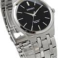 Мужские кварцевые часы Seiko — это надёжный и универсальный аксессуар. Корпус диаметром 36 мм выполнен из нержавеющей стали 316L. Циферблат чёрного цвета оформлен индексами и стрелками, включая центральную секундную стрелку. Циферблат защищён прочным закалённым минеральным стеклом Hardlex минеральным стекломМинеральное стеклоМинеральное стекло представляет собой искусственно выращенный минерал кварца. Такое стекло отличается особой устойчивостью к повреждениям и царапинам. Уступает по некоторым качествам сапфировому стеклу.. Механизм — кварцевый калибр 7N01 с высокой точностью хода (±10–15 сек. в месяц). Часы оснащены стальным браслетом на раскладной застёжкеРаскладная застёжкаТакой тип застёжки используется только на браслетах из металла. Она никогда не раскрывается полностью, происходит разделение на 2 и более частей. Раскладывающая застёжка снизит вероятность потери часов к минимуму. с фиксатором. Водонепроницаемость 50 м позволяет использовать часы в повседневных условиях. Идеальный выбор для тех, кто ценит японское качество и классический дизайн.