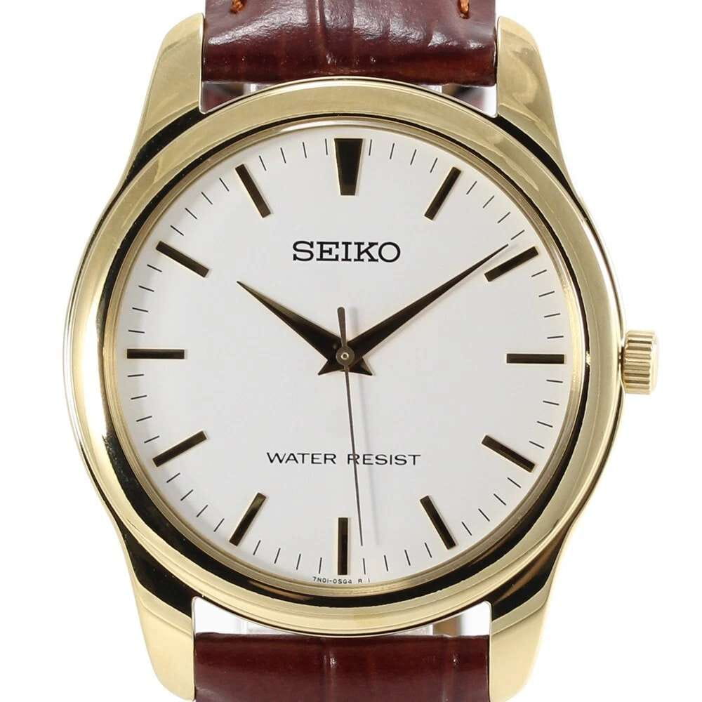 Женские кварцевые часы Seiko — это надёжный и универсальный аксессуар. Корпус диаметром 35 мм выполнен из нержавеющей стали с IP-покрытиемIP-покрытиеМетод ионного напыления. Демонстрирует повышенную устойчивость к истиранию, окислению и химическим веществам. Под воздействием высокого давления и температуры около 1500°C молекулы металла надёжно соединяются с частицами корпуса часов. цвета жёлтого золота. Циферблат белого цвета оформлен индексами и стрелками, включая центральную секундную стрелку. Циферблат защищён прочным закалённым минеральным стеклом Hardlex минеральным стекломМинеральное стеклоМинеральное стекло представляет собой искусственно выращенный минерал кварца. Такое стекло отличается особой устойчивостью к повреждениям и царапинам. Уступает по некоторым качествам сапфировому стеклу.. Механизм — японское кварцевое движение калибра 7N01 с высокой точностью хода (±10–15 сек. в месяц). Часы оснащены коричневым кожаным ремешком на классической пряжке. Водонепроницаемость 30 м позволяет использовать часы в повседневных условиях. Идеальный выбор для тех, кто ценит японское качество и классический дизайн.