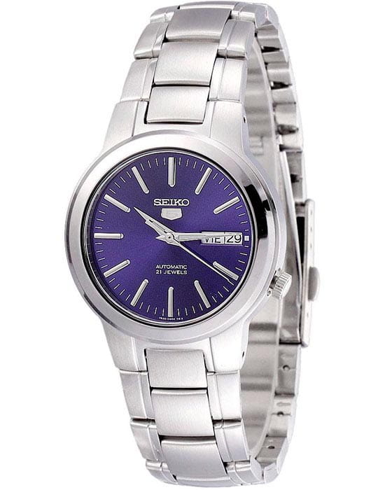 Seiko 5 SNKA05K1 — мужская автоматическая модель из классической линейки Seiko 5 Regular, сочетающая практичность и сдержанный дизайн. Корпус диаметром 37 мм и браслет выполнены из нержавеющей стали, создавая универсальный и надёжный образ. Защитную функцию выполняет минеральное стеклоМинеральное стеклоМинеральное стекло представляет собой искусственно выращенный минерал кварца. Такое стекло отличается особой устойчивостью к повреждениям и царапинам. Уступает по некоторым качествам сапфировому стеклу. Hardlex, устойчивое к повседневным повреждениям. В основе модели лежит автоматический калибр 7S26 с функциями часов, минут, секунд, даты и дня недели. Водозащита составляет 30 м, что защищает часы от брызг и дождя. Чёрный циферблат оформлен в лаконичном стиле с арабскими цифрами и стрелками, покрытыми люминесцентным покрытиемЛюминесцентное покрытиеПозволяет считывать показания времени в темноте. Производители наносят на стрелки, часовые индексы, безель или поверхность циферблата светонакопительный состав, дающий холодное свечение. для читаемости в темноте. Браслет из нержавеющей стали оснащён раскладной застёжкойРаскладная застёжкаТакой тип застёжки используется только на браслетах из металла. Она никогда не раскрывается полностью, происходит разделение на 2 и более частей. Раскладывающая застёжка снизит вероятность потери часов к минимуму., обеспечивающей удобство и надёжность при ежедневном использовании.