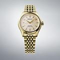 Механические часы Seiko Presage Classic Series — это воплощение японского мастерства и внимания к деталям. Модель выполнена в стиле, вдохновлённом традиционным японским искусством, с циферблатом цвета «широ-иро» — оттенка неотбелённого шелка, который при разном освещении играет глубокими переливами. Часы оснащены калибром 6R51 — надёжным механизмом с автоподзаводом и возможностью ручной подзаводки. Механизм работает на частоте 21 600 полуколебаний в час, имеет 24 драгоценных камня и обеспечивает запас хода до 72 часов. Также реализована функция стоп-секунды для точной установки времени. Корпус диаметром 36 мм выполнен из стали с золотым покрытием и оформлен в винтажном стиле, с плавными изогнутыми линиями. Защиту циферблата обеспечивает сапфировое стеклоСапфировое стеклоПрочный и надёжный материал из кристалла сапфира синтетического происхождения, характеризующийся особой твёрдостью и устойчивостью к царапинам и повреждениям. с двойным изгибом, повторяющее форму выпуклого циферблата. На задней крышке — прозрачное окно с винтовым креплением, через которое можно рассмотреть работу механизма. Браслет состоит из нескольких рядов звеньев с изогнутыми верхними поверхностями, обеспечивающими плотное и комфортное прилегание к запястью. Он оснащён раскладной застёжкойРаскладная застёжкаТакой тип застёжки используется только на браслетах из металла. Она никогда не раскрывается полностью, происходит разделение на 2 и более частей. Раскладывающая застёжка снизит вероятность потери часов к минимуму. с кнопочным механизмом, гарантирующей надёжную фиксацию. Общая длина браслета составляет 195 мм, что делает его подходящим для большинства размеров запястья. Часы водонепроницаемы до 100 метров (), что позволяет использовать их при плавании или занятиях водными видами спорта. Также они имеют защиту от магнитных полей до 4800 А/м. Эти часы станут идеальным выбором для тех, кто ценит сочетание традиций, технологий и эстетики — универсальный аксессуар, подчёркивающий вкус и индивидуальность своего владельца.