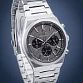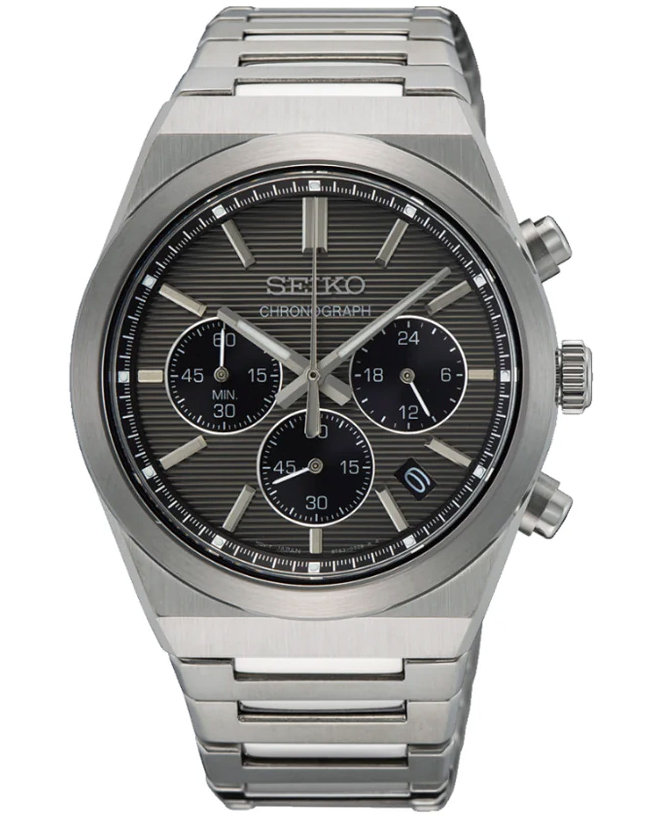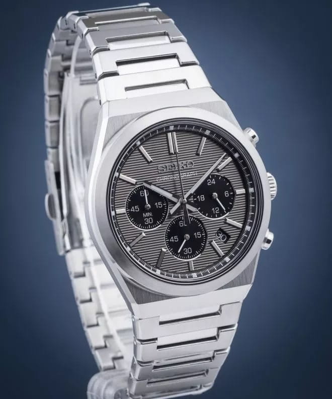 Мужские японские часы Seiko SSB455P1 c хронографомХронографФункция позволяет измерять отрезки времени с особой точностью: часы, минуты, секунды. Верным признаком хронографа является наличие на циферблате 3 дополнительных окошек-счётчиков., кварцевый механизм с высокой точностью. Минеральное стеклоМинеральное стеклоМинеральное стекло представляет собой искусственно выращенный минерал кварца. Такое стекло отличается особой устойчивостью к повреждениям и царапинам. Уступает по некоторым качествам сапфировому стеклу., устойчивое к появлению царапин, обладающее высокой прозрачностью. Класс водозащиты: 100 метров, позволит плавать, нырять и заниматься другими водными видами спорта. Корпус и браслет часов изготовлен из стали. Неподвижный безельБезельВнешний ободок, закрепляющий стекло. В спортивных часах так называется поворотное кольцо с делениями на циферблате, выполняет роль таймера – замеряет отрезки времени на шкале. Неподвижный безель – элемент декора. Однонаправленно вращающийся безель на дайверских часах позволяет фиксировать моменты погружения и выныривания на поверхность. со шкалой тахиметраТахиметрРазмеченная шкала, располагается на ободке или безеле часов. Тахиметр позволяет рассчитать скорость на определённом участке пути, расстояние измеряется в километрах или милях.. Стрелки и метки с люминесцентным покрытиемЛюминесцентное покрытиеПозволяет считывать показания времени в темноте. Производители наносят на стрелки, часовые индексы, безель или поверхность циферблата светонакопительный состав, дающий холодное свечение. LumiBrite. Браслет на раскладной застёжкеРаскладная застёжкаТакой тип застёжки используется только на браслетах из металла. Она никогда не раскрывается полностью, происходит разделение на 2 и более частей. Раскладывающая застёжка снизит вероятность потери часов к минимуму. с кнопками. СекундомерСекундомерСекундоме́р — прибор, способный измерять интервалы времени с точностью до долей секунды.. Окошко даты находится в положении между 4 и 5 часов.