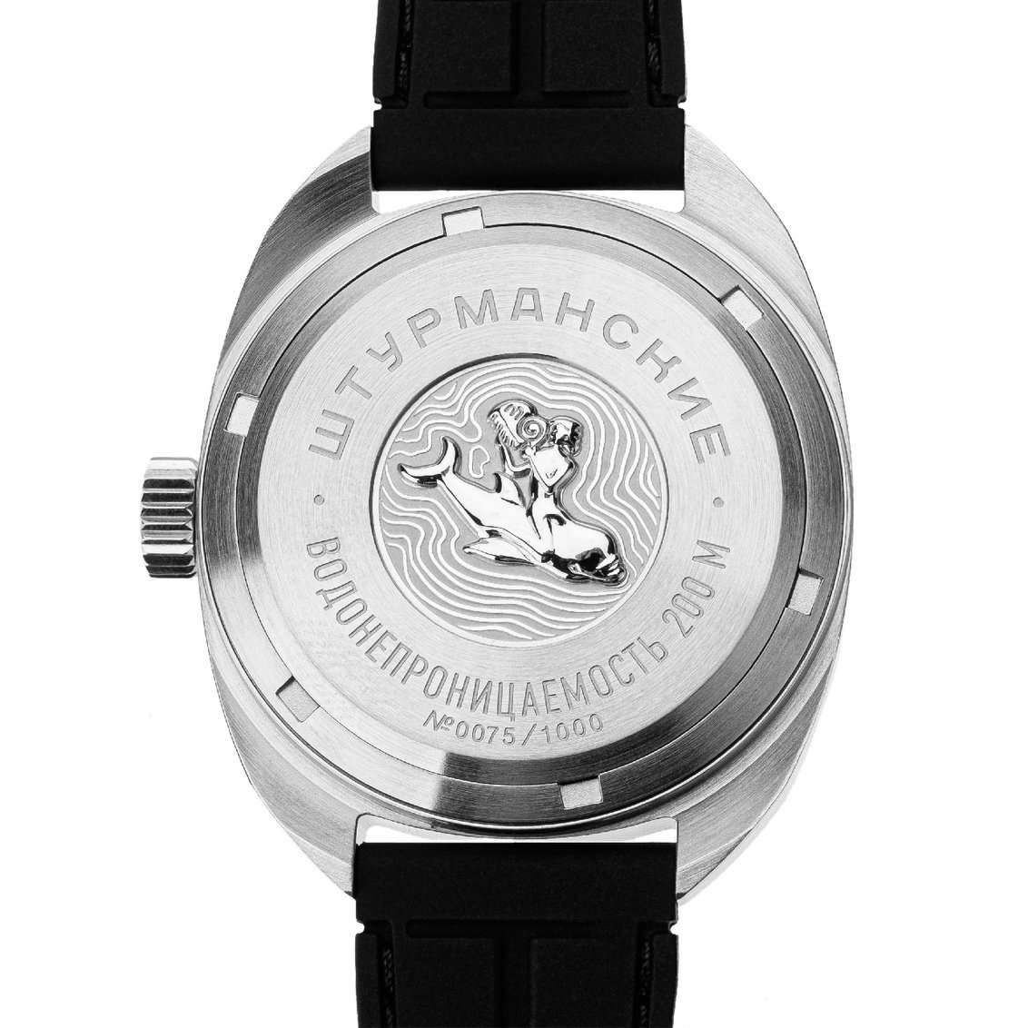Мужские механические часы с автоподзаводом Штурманские Амфибия 2416/8881506 с высокой точностью. Корпус из нержавеющей стали диаметром 42 мм идеально сбалансирован и элегантен. Минеральное стеклоМинеральное стеклоМинеральное стекло представляет собой искусственно выращенный минерал кварца. Такое стекло отличается особой устойчивостью к повреждениям и царапинам. Уступает по некоторым качествам сапфировому стеклу. устойчивое к мелким механическим повреждениям. Силиконовый ремешок на стандартной застёжке, обеспечивает комфортное ношение. Класс водозащиты: 200 метров, позволит плавать, нырять и заниматься другими водными видами спорта. Стрелки и метки на циферблате имеют люминесцентное покрытиеЛюминесцентное покрытиеПозволяет считывать показания времени в темноте. Производители наносят на стрелки, часовые индексы, безель или поверхность циферблата светонакопительный состав, дающий холодное свечение. позволяющее легко определять время даже в темноте. Окошко даты находится в положении 3 часа. Рифленая заводная головка. БезельБезельВнешний ободок, закрепляющий стекло. В спортивных часах так называется поворотное кольцо с делениями на циферблате, выполняет роль таймера – замеряет отрезки времени на шкале. Неподвижный безель – элемент декора. Однонаправленно вращающийся безель на дайверских часах позволяет фиксировать моменты погружения и выныривания на поверхность. с PVD-покрытиемPVDУльтратонкое покрытие наносится в технике вакуумного напыления, сочетает в себе нитрид титана особой прочности со слоем золота или оксида хрома. Несёт в себе декоративную или защитную функцию. и минутной шкалой поворачивается в одном направлении.