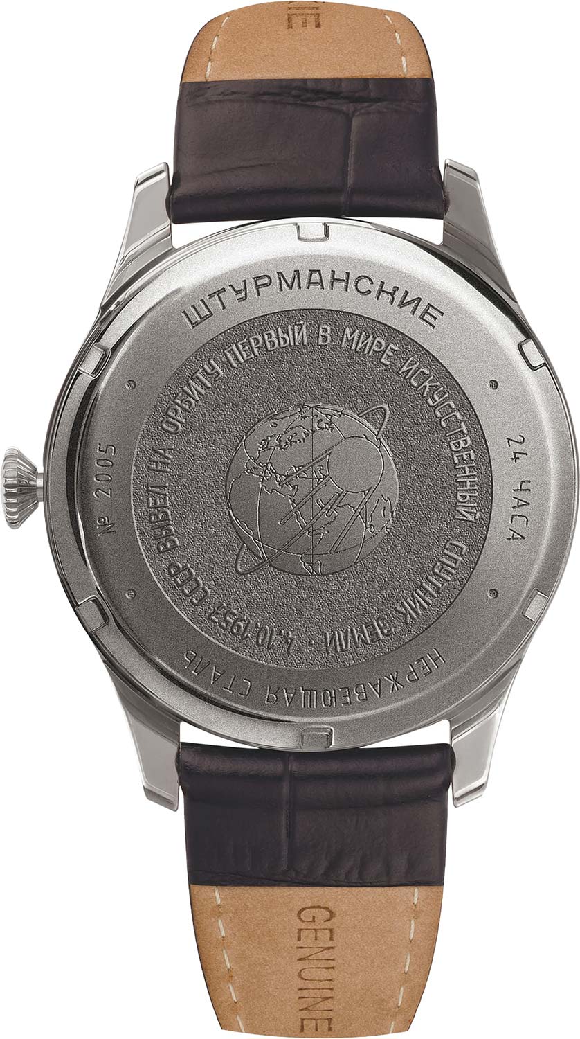 Штурманские мужские российские кварцевые часы с минеральным стекломМинеральное стеклоМинеральное стекло представляет собой искусственно выращенный минерал кварца. Такое стекло отличается особой устойчивостью к повреждениям и царапинам. Уступает по некоторым качествам сапфировому стеклу. кварцевый механизм с высокой точностью. Класс водозащиты: 50 метров, позволит защитить корпус от случайных брызг или капель дождя. Корпус часов изготовлен из стали. Кожаный ремешок на стандартной застёжке. Стрелки и метки с люминесцентным покрытиемЛюминесцентное покрытиеПозволяет считывать показания времени в темноте. Производители наносят на стрелки, часовые индексы, безель или поверхность циферблата светонакопительный состав, дающий холодное свечение.. Окошко даты находится в положении 3 часа.