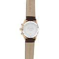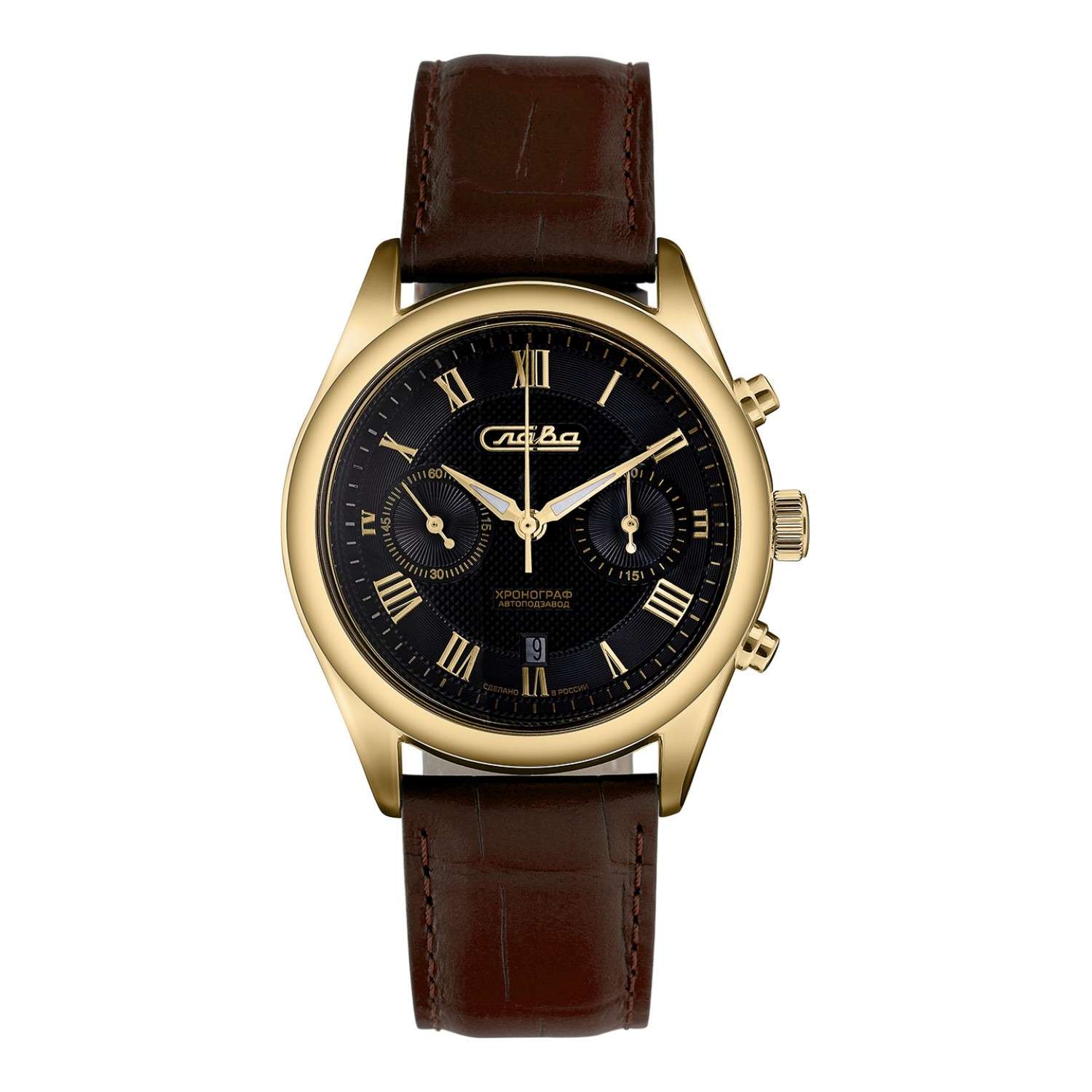 Российские механические наручные часы-хронографХронографФункция позволяет измерять отрезки времени с особой точностью: часы, минуты, секунды. Верным признаком хронографа является наличие на циферблате 3 дополнительных окошек-счётчиков. с секундомеромСекундомерСекундоме́р — прибор, способный измерять интервалы времени с точностью до долей секунды. Слава Сенат 1889258/300-4617, которые станут идеальным аксессуаром для повседневного ношения. Эти часы сочетают в себе элегантность и практичность, предлагая безупречный стиль и надежность. Оснащенные механизмом Peacock 4617 с автоподзаводом, они обеспечивают точность и долговечность. Стальной корпус с IP-покрытиемIP-покрытиеМетод ионного напыления. Демонстрирует повышенную устойчивость к истиранию, окислению и химическим веществам. Под воздействием высокого давления и температуры около 1500°C молекулы металла надёжно соединяются с частицами корпуса часов. золотистого цвета и  сапфировым стекломСапфировое стеклоПрочный и надёжный материал из кристалла сапфира синтетического происхождения, характеризующийся особой твёрдостью и устойчивостью к царапинам и повреждениям. защищает черный циферблат с римскими цифрами. Часы также имеют календарь с окошком даты на 6 часах и водозащиту до 50WR, что делает их надежными в различных условиях. Стрелки часов с люминесцентным покрытиемЛюминесцентное покрытиеПозволяет считывать показания времени в темноте. Производители наносят на стрелки, часовые индексы, безель или поверхность циферблата светонакопительный состав, дающий холодное свечение., что облегчает чтение времени даже в условиях слабого освещения. Текстурированный кожаный коричневый ремешок с классической застежкой завершает этот изысканный образ.