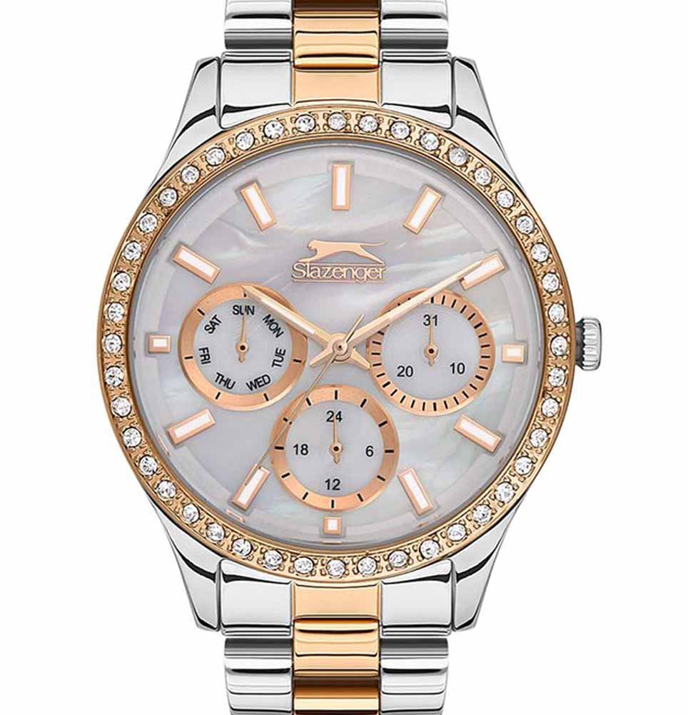 Женские наручные часы Slazenger SL.09.2069.4.02 сочетают в себе классический дизайн и высокое качество исполнения. Модель обладает круглым корпусом диаметром 34 мм, изготовленным из суперметалла, что обеспечивает устойчивость к внешним воздействиям. Браслет выполнен из суперметалла с частичным IP-покрытиемIP-покрытиеМетод ионного напыления. Демонстрирует повышенную устойчивость к истиранию, окислению и химическим веществам. Под воздействием высокого давления и температуры около 1500°C молекулы металла надёжно соединяются с частицами корпуса часов. на раскладной застёжкеРаскладная застёжкаТакой тип застёжки используется только на браслетах из металла. Она никогда не раскрывается полностью, происходит разделение на 2 и более частей. Раскладывающая застёжка снизит вероятность потери часов к минимуму.. Неподвижный безельБезельВнешний ободок, закрепляющий стекло. В спортивных часах так называется поворотное кольцо с делениями на циферблате, выполняет роль таймера – замеряет отрезки времени на шкале. Неподвижный безель – элемент декора. Однонаправленно вращающийся безель на дайверских часах позволяет фиксировать моменты погружения и выныривания на поверхность. из суперметалла с IP-покрытиемIP-покрытиеМетод ионного напыления. Демонстрирует повышенную устойчивость к истиранию, окислению и химическим веществам. Под воздействием высокого давления и температуры около 1500°C молекулы металла надёжно соединяются с частицами корпуса часов. украшен кристаллами. Перламутровый циферблат оформлен логотипом бренда и метками времени. Имеются дополнительные малые циферблаты для отображения даты, дня недели и текущего времени в 24-часовом формате. Для защиты используется минеральное стеклоМинеральное стеклоМинеральное стекло представляет собой искусственно выращенный минерал кварца. Такое стекло отличается особой устойчивостью к повреждениям и царапинам. Уступает по некоторым качествам сапфировому стеклу., обеспечивающее прочную защиту от царапин. Стрелки и метки имеют люминесцентное покрытиеЛюминесцентное покрытиеПозволяет считывать показания времени в темноте. Производители наносят на стрелки, часовые индексы, безель или поверхность циферблата светонакопительный состав, дающий холодное свечение., что позволяет легко читать время в темноте. Часы работают на японском кварцевом механизме, который обеспечивает точность хода без необходимости подзаводки. Водонепроницаемость часов составляет 3 атмосферы (WR30), что позволяет защитить корпус от случайных брызг или капель дождя.