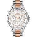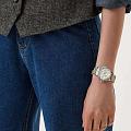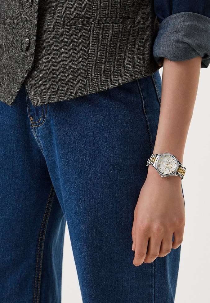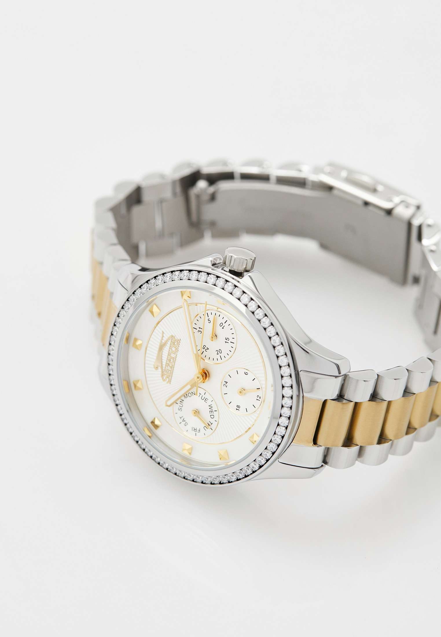 Эти женские часы Slazenger SL.09.2241.4.02 выполнены в современном стиле и станет элегантным дополнением к любому образу. Корпус и браслет изготовлены из прочного металла серебристого цвета, безельБезельВнешний ободок, закрепляющий стекло. В спортивных часах так называется поворотное кольцо с делениями на циферблате, выполняет роль таймера – замеряет отрезки времени на шкале. Неподвижный безель – элемент декора. Однонаправленно вращающийся безель на дайверских часах позволяет фиксировать моменты погружения и выныривания на поверхность. украшен изящными кристаллами, которые придают часам особую привлекательность. На циферблате расположены дополнительные малые циферблаты для отображения даты, дня недели и времени в 24-часовом формате, что делает их функциональными и удобными для ежедневного использования. Минеральное стеклоМинеральное стеклоМинеральное стекло представляет собой искусственно выращенный минерал кварца. Такое стекло отличается особой устойчивостью к повреждениям и царапинам. Уступает по некоторым качествам сапфировому стеклу. надежно защищает циферблат от царапин, а водозащита уровня WR 30 предохраняет механизм от случайных брызг воды. Заводная головка оснащена защитой, а стрелки имеют подсветку для легкого считывания времени в темноте. Диаметр корпуса составляет 34 мм, ширина браслета — 16 мм, толщина корпуса — 9 мм. Часы фиксируются на руке с помощью браслета из металла с частичным розово-золотистым IP-покрытиемIP-покрытиеМетод ионного напыления. Демонстрирует повышенную устойчивость к истиранию, окислению и химическим веществам. Под воздействием высокого давления и температуры около 1500°C молекулы металла надёжно соединяются с частицами корпуса часов. удобной раскладной застёжкиРаскладная застёжкаТакой тип застёжки используется только на браслетах из металла. Она никогда не раскрывается полностью, происходит разделение на 2 и более частей. Раскладывающая застёжка снизит вероятность потери часов к минимуму.. Вес изделия подобран для комфортной ежедневной носки. Для удобства использования в темное время суток предусмотрено люминесцентное покрытиеЛюминесцентное покрытиеПозволяет считывать показания времени в темноте. Производители наносят на стрелки, часовые индексы, безель или поверхность циферблата светонакопительный состав, дающий холодное свечение. стрелок.
