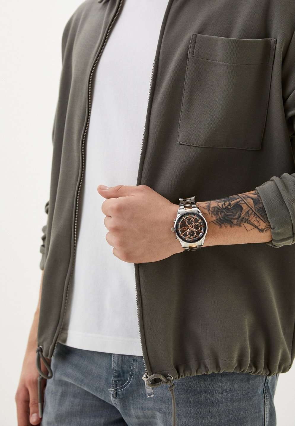 Часы Slazenger SL.09.2242.2.02 – это стильная и надежная модель, созданная для современных мужчин, ценящих качество и функциональность. Корпус и браслет выполнены из прочного металла серебряного цвета, что придает аксессуару элегантный внешний вид и обеспечивает долговечность. Часы фиксируются на руке с помощью браслета из металла с частичным золотистым IP-покрытиемIP-покрытиеМетод ионного напыления. Демонстрирует повышенную устойчивость к истиранию, окислению и химическим веществам. Под воздействием высокого давления и температуры около 1500°C молекулы металла надёжно соединяются с частицами корпуса часов. и удобной раскладной застёжкойРаскладная застёжкаТакой тип застёжки используется только на браслетах из металла. Она никогда не раскрывается полностью, происходит разделение на 2 и более частей. Раскладывающая застёжка снизит вероятность потери часов к минимуму.. Кварцевый механизм гарантирует точность хода, а минеральное стеклоМинеральное стеклоМинеральное стекло представляет собой искусственно выращенный минерал кварца. Такое стекло отличается особой устойчивостью к повреждениям и царапинам. Уступает по некоторым качествам сапфировому стеклу. защищает графитовый циферблат от царапин и повреждений. Диаметр корпуса составляет 46 мм, толщина – 13 мм, ширина ремешка – 24 мм, а вес часов – 146 грамм, что делает их удобными для повседневного ношения. Водозащита уровня WR 50 позволяет не снимать часы во время мытья рук и при незначительном контакте с водой. Для удобства использования в темное время суток предусмотрено люминесцентное покрытиеЛюминесцентное покрытиеПозволяет считывать показания времени в темноте. Производители наносят на стрелки, часовые индексы, безель или поверхность циферблата светонакопительный состав, дающий холодное свечение. стрелок. Модель оснащена дополнительными циферблатами, отображающими дату, день недели и текущее время в 24-часовом формате.