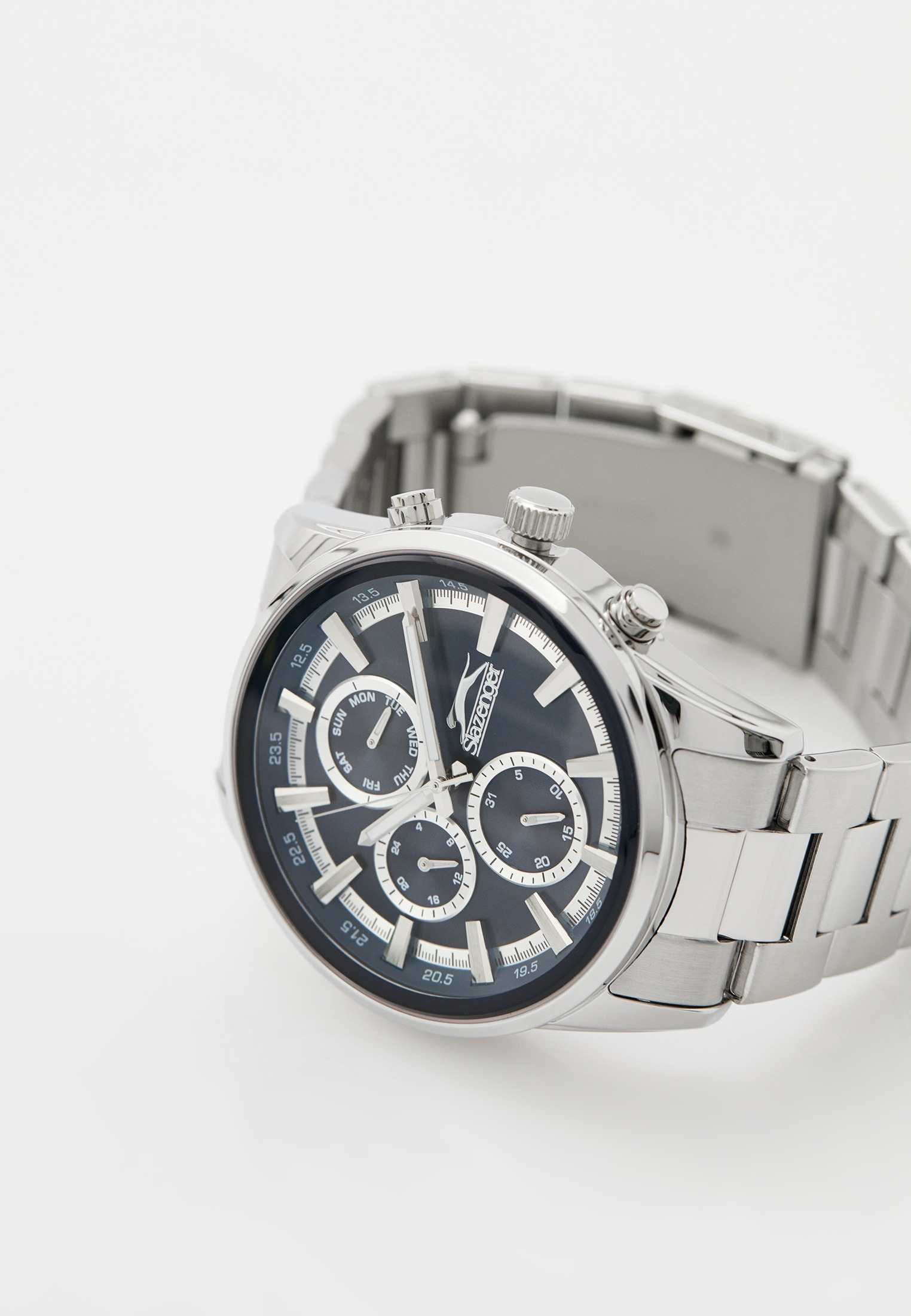 Часы Slazenger SL.09.2242.2.03 – это стильная и надежная модель, созданная для современных мужчин, ценящих качество и функциональность. Корпус и браслет выполнены из прочного металла серебряного цвета, что придает аксессуару элегантный внешний вид и обеспечивает долговечность. Часы фиксируются на руке с помощью браслета с удобной раскладной застёжкойРаскладная застёжкаТакой тип застёжки используется только на браслетах из металла. Она никогда не раскрывается полностью, происходит разделение на 2 и более частей. Раскладывающая застёжка снизит вероятность потери часов к минимуму.. Кварцевый механизм гарантирует точность хода, а минеральное стеклоМинеральное стеклоМинеральное стекло представляет собой искусственно выращенный минерал кварца. Такое стекло отличается особой устойчивостью к повреждениям и царапинам. Уступает по некоторым качествам сапфировому стеклу. защищает синий циферблат от царапин и повреждений. Диаметр корпуса составляет 46 мм, толщина – 13 мм, ширина ремешка – 24 мм, а вес часов – 146 грамм, что делает их удобными для повседневного ношения. Водозащита уровня WR 50 позволяет не снимать часы во время мытья рук и при незначительном контакте с водой. Для удобства использования в темное время суток предусмотрено люминесцентное покрытиеЛюминесцентное покрытиеПозволяет считывать показания времени в темноте. Производители наносят на стрелки, часовые индексы, безель или поверхность циферблата светонакопительный состав, дающий холодное свечение. стрелок. Модель оснащена дополнительными циферблатами, отображающими дату, день недели и текущее время в 24-часовом формате.