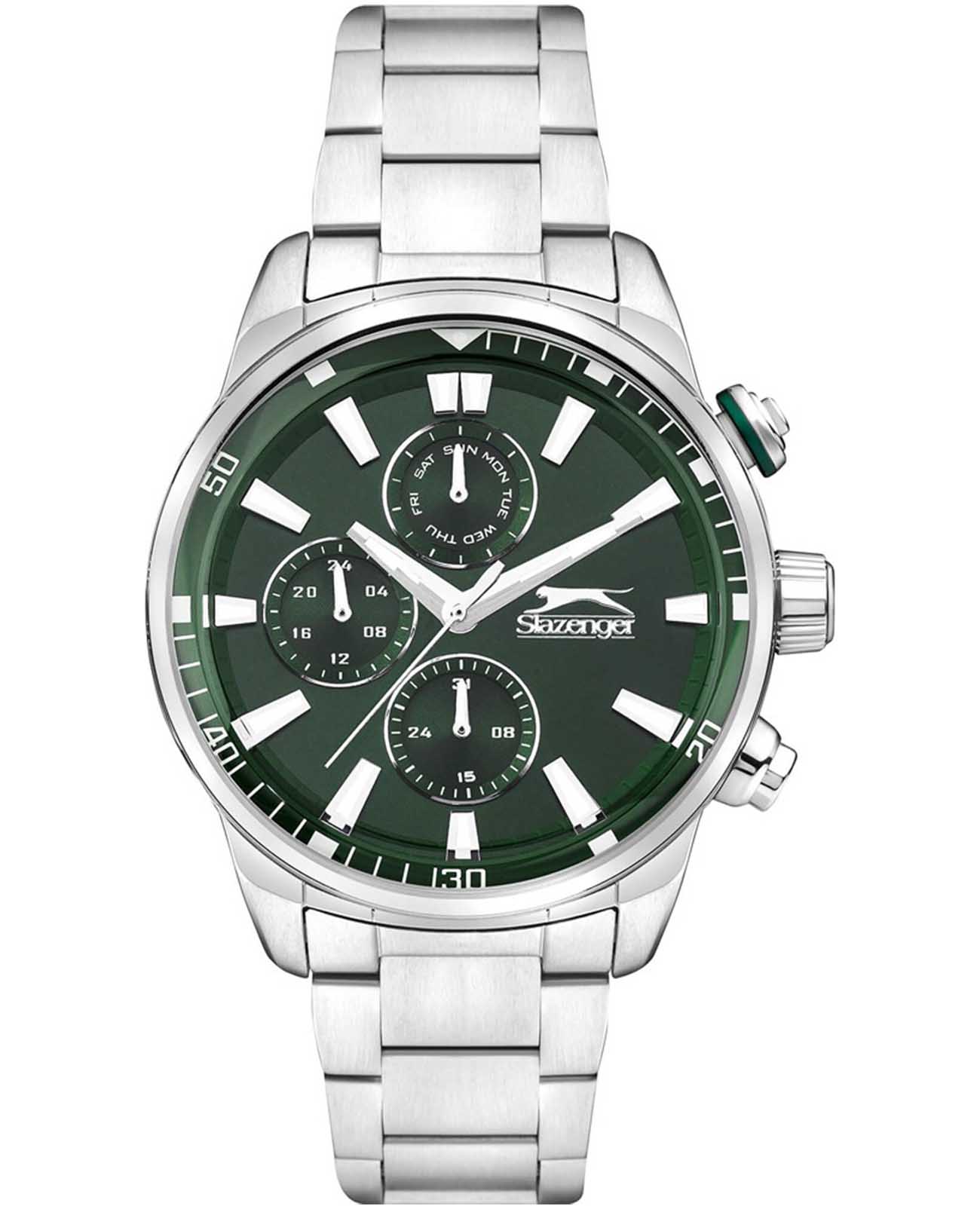 Часы Slazenger SL.09.2272.2.07 – это стильный аксессуар, сочетающий в себе современный дизайн и продуманную функциональность. Модель оснащена точным кварцевым механизмом, который гарантирует стабильную работу и легкость в использовании. Корпус и браслет выполнены из суперметалла — инновационного сплава на основе меди с пониженным содержанием цинка и никеля, обладающего высокой прочностью и устойчивостью к износу благодаря особой технологии покрытия. Элегантный зеленый циферблат защищён надёжным минеральным стекломМинеральное стеклоМинеральное стекло представляет собой искусственно выращенный минерал кварца. Такое стекло отличается особой устойчивостью к повреждениям и царапинам. Уступает по некоторым качествам сапфировому стеклу., устойчивым к царапинам и повреждениям. На циферблате размещены отдельные индикаторы: 24-часовой указатель времени, а также дополнительные циферблаты для отображения даты и дня недели, что делает модель максимально информативной и удобной в повседневном использовании. Водозащита 5 АТМ (5 бар) надёжно защищает механизм от брызг и дождя, а диаметр корпуса 45 мм и толщина 13 мм обеспечивают солидный внешний вид и комфортную посадку на запястье. Стальной браслет с раскладной застёжкойРаскладная застёжкаТакой тип застёжки используется только на браслетах из металла. Она никогда не раскрывается полностью, происходит разделение на 2 и более частей. Раскладывающая застёжка снизит вероятность потери часов к минимуму. обеспечивает комфортную посадку. Стрелки с люминесцентным покрытиемЛюминесцентное покрытиеПозволяет считывать показания времени в темноте. Производители наносят на стрелки, часовые индексы, безель или поверхность циферблата светонакопительный состав, дающий холодное свечение. удобно подсвечиваются в темноте после зарядки на свету. Часы подойдут как для ежедневного ношения, так и для особых случаев, а универсальный дизайн подчеркнёт индивидуальность и вкус владельца.