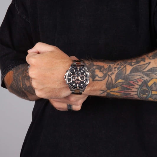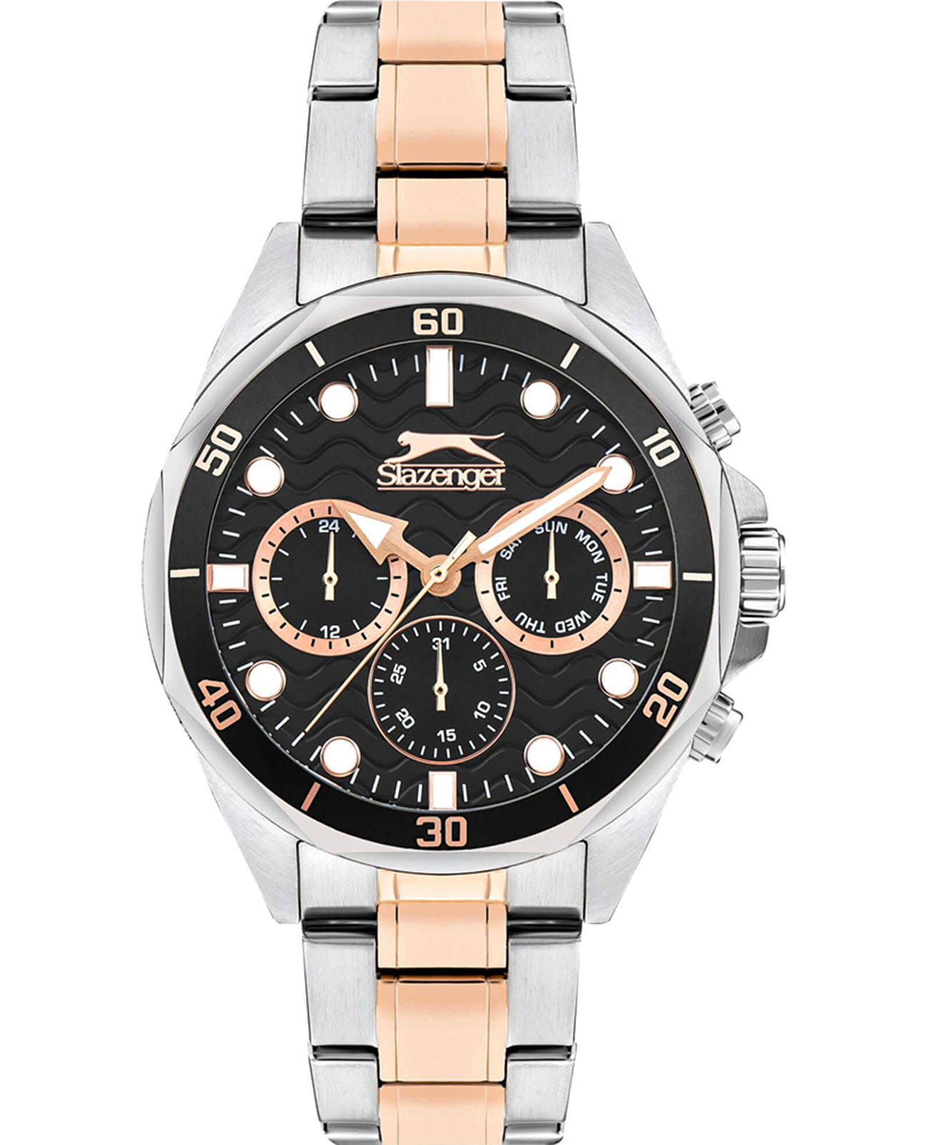 Мужские кварцевые часы Slazenger SL.09.2309.2.04 — это выразительный и функциональный аксессуар, сочетающий прочность, стиль и насыщенную комплектацию. Браслет выполнен из суперметалла с IP-покрытиемIP-покрытиеМетод ионного напыления. Демонстрирует повышенную устойчивость к истиранию, окислению и химическим веществам. Под воздействием высокого давления и температуры около 1500°C молекулы металла надёжно соединяются с частицами корпуса часов., защищён минеральным стекломМинеральное стеклоМинеральное стекло представляет собой искусственно выращенный минерал кварца. Такое стекло отличается особой устойчивостью к повреждениям и царапинам. Уступает по некоторым качествам сапфировому стеклу.. Циферблат чёрного цвета оформлен с вынесенными малыми циферблатами для индикации дня недели, даты и времени в 24-часовом формате. Стрелки и метки оснащены люминесцентным покрытиемЛюминесцентное покрытиеПозволяет считывать показания времени в темноте. Производители наносят на стрелки, часовые индексы, безель или поверхность циферблата светонакопительный состав, дающий холодное свечение., обеспечивающим хорошую читаемость в темноте. Заводная головка снабжена защитой, а задняя крышка — завинчивающаяся, что повышает надёжность конструкции. Браслет комбинированного цвета фиксируется на раскладной застёжкеРаскладная застёжкаТакой тип застёжки используется только на браслетах из металла. Она никогда не раскрывается полностью, происходит разделение на 2 и более частей. Раскладывающая застёжка снизит вероятность потери часов к минимуму., обеспечивая удобство и безопасность ношения. Водонепроницаемость 50 м позволяет использовать часы в повседневных условиях, защищая от случайных брызг и капель дождя. Модель подчёркивает индивидуальность владельца и идеально подходит как для повседневного, так и для делового образа.