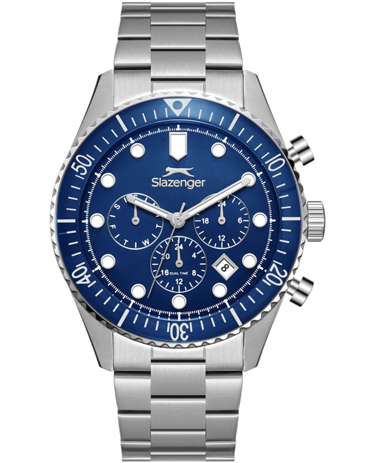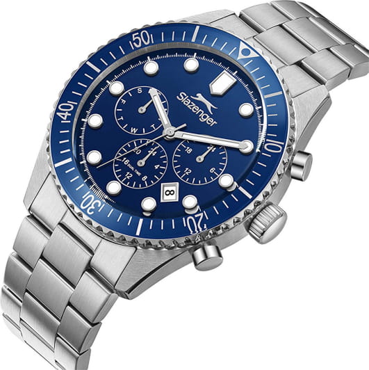 Мужские кварцевые часы Slazenger — это выразительный и функциональный аксессуар. Корпус диаметром 43 мм и толщиной 12 мм выполнен из нержавеющей стали 316L. Циферблат синего цвета оформлен индексами и стрелками. Циферблат защищён минеральным стекломМинеральное стеклоМинеральное стекло представляет собой искусственно выращенный минерал кварца. Такое стекло отличается особой устойчивостью к повреждениям и царапинам. Уступает по некоторым качествам сапфировому стеклу.. Механизм — кварцевый. Часы оснащены индикацией дня недели, даты, 12/24-часового формата времени и функцией второго часового пояса (GMT)Второй часовой поясФункция, позволяющая отображать время двух часовых поясов одновременно.. Окошко даты расположено между 4 и 5 часами. Стрелки и метки с люминесцентным покрытиемЛюминесцентное покрытиеПозволяет считывать показания времени в темноте. Производители наносят на стрелки, часовые индексы, безель или поверхность циферблата светонакопительный состав, дающий холодное свечение., обеспечивающим хорошую читаемость в темноте. БезельБезельВнешний ободок, закрепляющий стекло. В спортивных часах так называется поворотное кольцо с делениями на циферблате, выполняет роль таймера – замеряет отрезки времени на шкале. Неподвижный безель – элемент декора. Однонаправленно вращающийся безель на дайверских часах позволяет фиксировать моменты погружения и выныривания на поверхность. с IP-покрытиемIP-покрытиеМетод ионного напыления. Демонстрирует повышенную устойчивость к истиранию, окислению и химическим веществам. Под воздействием высокого давления и температуры около 1500°C молекулы металла надёжно соединяются с частицами корпуса часов.. Часы оснащены стальным браслетом с раскладной застёжкойРаскладная застёжкаТакой тип застёжки используется только на браслетах из металла. Она никогда не раскрывается полностью, происходит разделение на 2 и более частей. Раскладывающая застёжка снизит вероятность потери часов к минимуму.. Водонепроницаемость 100 м позволяет использовать часы для плавания и повседневного ношения. Гарантия — 12 месяцев. Идеальный выбор для тех, кто ценит стиль, функциональность и качество.