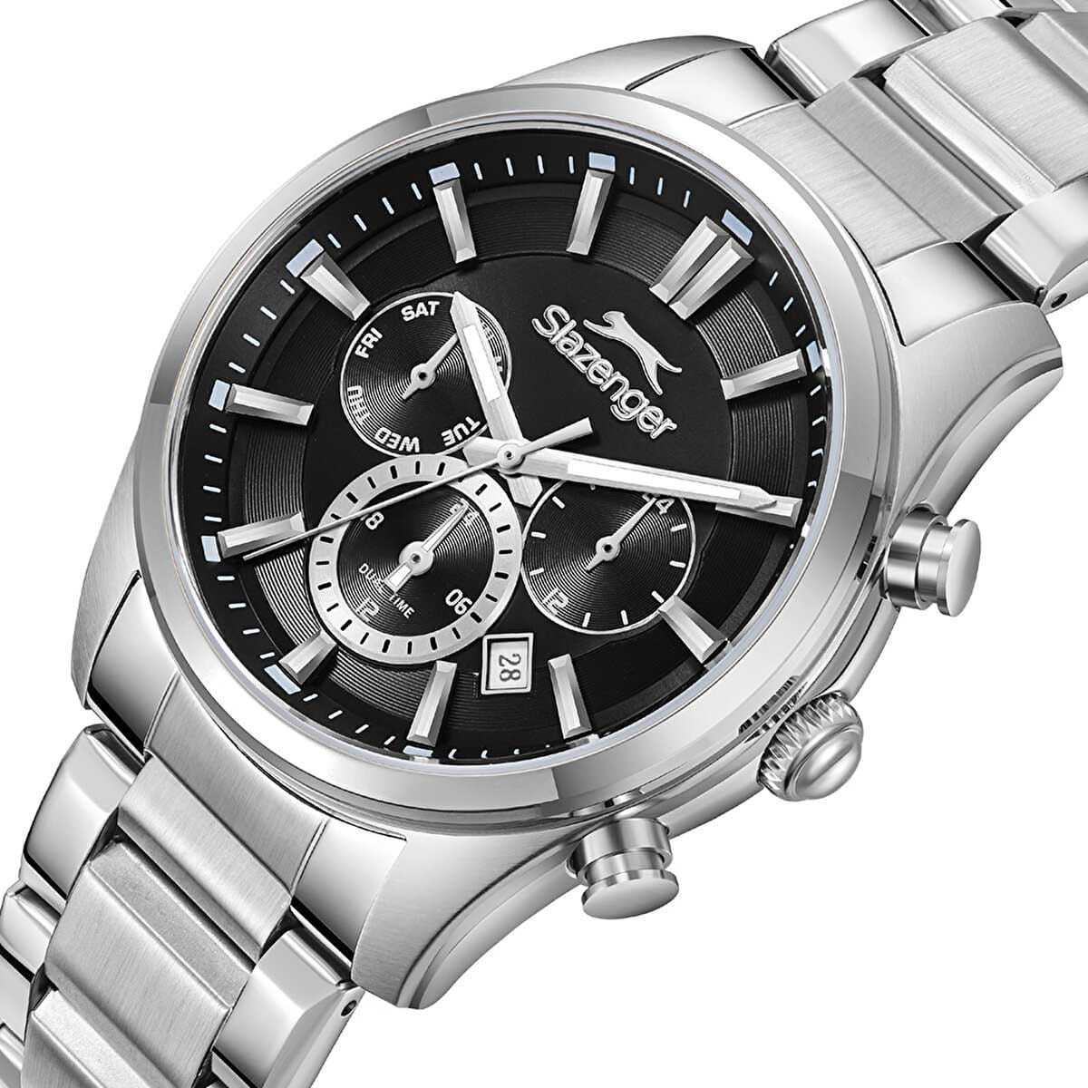 Мужские кварцевые часы Slazenger — это выразительный и функциональный аксессуар. Корпус диаметром 43 мм и толщиной 12 мм выполнен из нержавеющей стали 316L. Циферблат чёрного цвета оформлен индексами и стрелками с люминесцентным покрытиемЛюминесцентное покрытиеПозволяет считывать показания времени в темноте. Производители наносят на стрелки, часовые индексы, безель или поверхность циферблата светонакопительный состав, дающий холодное свечение., обеспечивающим хорошую читаемость в темноте. Циферблат защищён минеральным стекломМинеральное стеклоМинеральное стекло представляет собой искусственно выращенный минерал кварца. Такое стекло отличается особой устойчивостью к повреждениям и царапинам. Уступает по некоторым качествам сапфировому стеклу.. Механизм — кварцевый калибр JP25. Часы оснащены индикацией дня недели, даты, 12/24-часового формата времени и функцией второго часового пояса (GMT)Второй часовой поясФункция, позволяющая отображать время двух часовых поясов одновременно.. Окошко даты расположено между 4 и 5 часами. Часы оснащены стальным браслетом из нержавеющей стали 316L с раскладной застёжкойРаскладная застёжкаТакой тип застёжки используется только на браслетах из металла. Она никогда не раскрывается полностью, происходит разделение на 2 и более частей. Раскладывающая застёжка снизит вероятность потери часов к минимуму.. Водонепроницаемость 100 м позволяет использовать часы для плавания и повседневного ношения. Гарантия — 12 месяцев. Идеальный выбор для тех, кто ценит стиль, функциональность и качество.