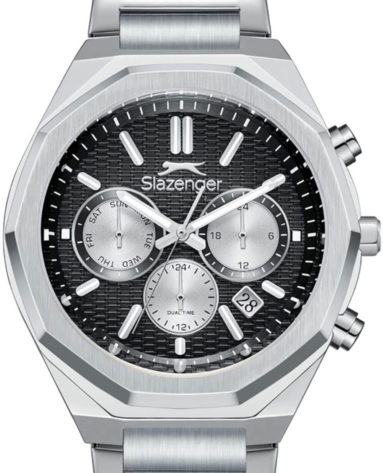 Мужские кварцевые часы Slazenger — это выразительный и функциональный аксессуар. Корпус диаметром 42 мм и толщиной 12,5 мм выполнен из нержавеющей стали 316L. Циферблат чёрного цвета оформлен индексами и стрелками. Окошко даты расположено между 4 и 5 часами. Указатель дня недели и 24-часовой формат времени вынесены на отдельные субциферблаты. Циферблат защищён минеральным стекломМинеральное стеклоМинеральное стекло представляет собой искусственно выращенный минерал кварца. Такое стекло отличается особой устойчивостью к повреждениям и царапинам. Уступает по некоторым качествам сапфировому стеклу.. Механизм — кварцевый калибр JP25. Часы оснащены функцией второго часового пояса (GMT)Второй часовой поясФункция, позволяющая отображать время двух часовых поясов одновременно.. Стрелки и метки с люминесцентным покрытиемЛюминесцентное покрытиеПозволяет считывать показания времени в темноте. Производители наносят на стрелки, часовые индексы, безель или поверхность циферблата светонакопительный состав, дающий холодное свечение., обеспечивающим хорошую читаемость в темноте. Часы оснащены стальным браслетом с раскладной застёжкойРаскладная застёжкаТакой тип застёжки используется только на браслетах из металла. Она никогда не раскрывается полностью, происходит разделение на 2 и более частей. Раскладывающая застёжка снизит вероятность потери часов к минимуму.. Водонепроницаемость 100 м позволяет использовать часы для плавания и повседневного ношения. Гарантия — 12 месяцев. Идеальный выбор для тех, кто ценит стиль, функциональность и качество.