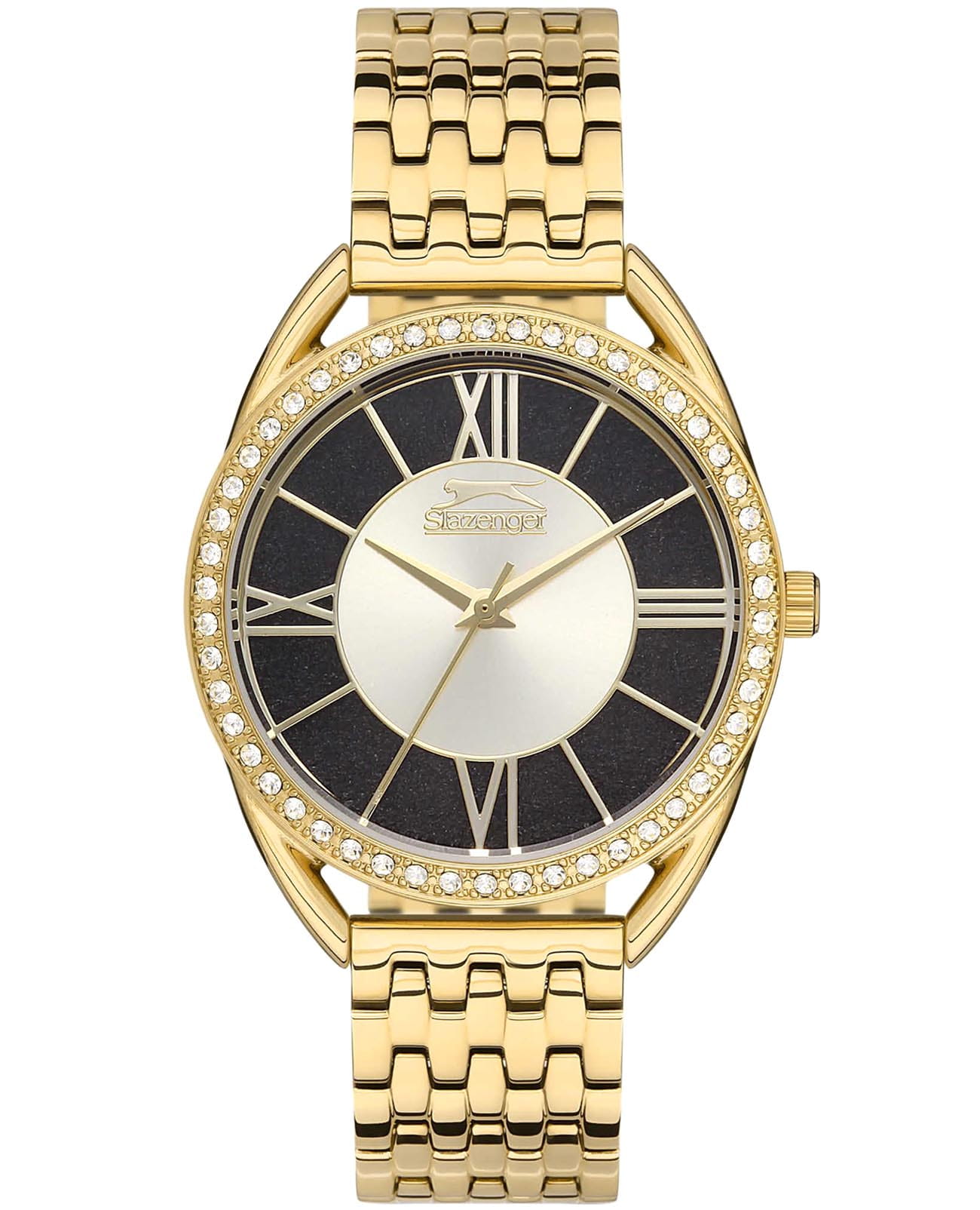 Женские кварцевые часы Slazenger SL.09.6537.3.03 – это сочетание элегантности, современного стиля и надёжности. Изящный корпус из суперметалла с IP-покрытиемIP-покрытиеМетод ионного напыления. Демонстрирует повышенную устойчивость к истиранию, окислению и химическим веществам. Под воздействием высокого давления и температуры около 1500°C молекулы металла надёжно соединяются с частицами корпуса часов. золотистого цвета, диаметром 35 мм и толщиной 9 мм, подчёркивает утончённость модели и делает их идеальным аксессуаром для любой ситуации – будь то деловая встреча, романтический вечер или повседневные выходы. Циферблат надёжно защищён минеральным стекломМинеральное стеклоМинеральное стекло представляет собой искусственно выращенный минерал кварца. Такое стекло отличается особой устойчивостью к повреждениям и царапинам. Уступает по некоторым качествам сапфировому стеклу., которое устойчиво к механическим повреждениям и сохраняет кристальную прозрачность. БезельБезельВнешний ободок, закрепляющий стекло. В спортивных часах так называется поворотное кольцо с делениями на циферблате, выполняет роль таймера – замеряет отрезки времени на шкале. Неподвижный безель – элемент декора. Однонаправленно вращающийся безель на дайверских часах позволяет фиксировать моменты погружения и выныривания на поверхность. украшен фианитами. Браслет из суперметалла с IP-покрытиемIP-покрытиеМетод ионного напыления. Демонстрирует повышенную устойчивость к истиранию, окислению и химическим веществам. Под воздействием высокого давления и температуры около 1500°C молекулы металла надёжно соединяются с частицами корпуса часов. удобно облегает запястье и фиксируется с помощью раскладной застёжкиРаскладная застёжкаТакой тип застёжки используется только на браслетах из металла. Она никогда не раскрывается полностью, происходит разделение на 2 и более частей. Раскладывающая застёжка снизит вероятность потери часов к минимуму., обеспечивая надёжность и комфорт в повседневном ношении. Утончённый стиль, внимание к деталям и практичность делают эту модель идеальным выбором для современных женщин, ценящих эстетику и функциональность. Водозащита до 30 метров позволит защитить корпус от случайных брызг или капель дождя.