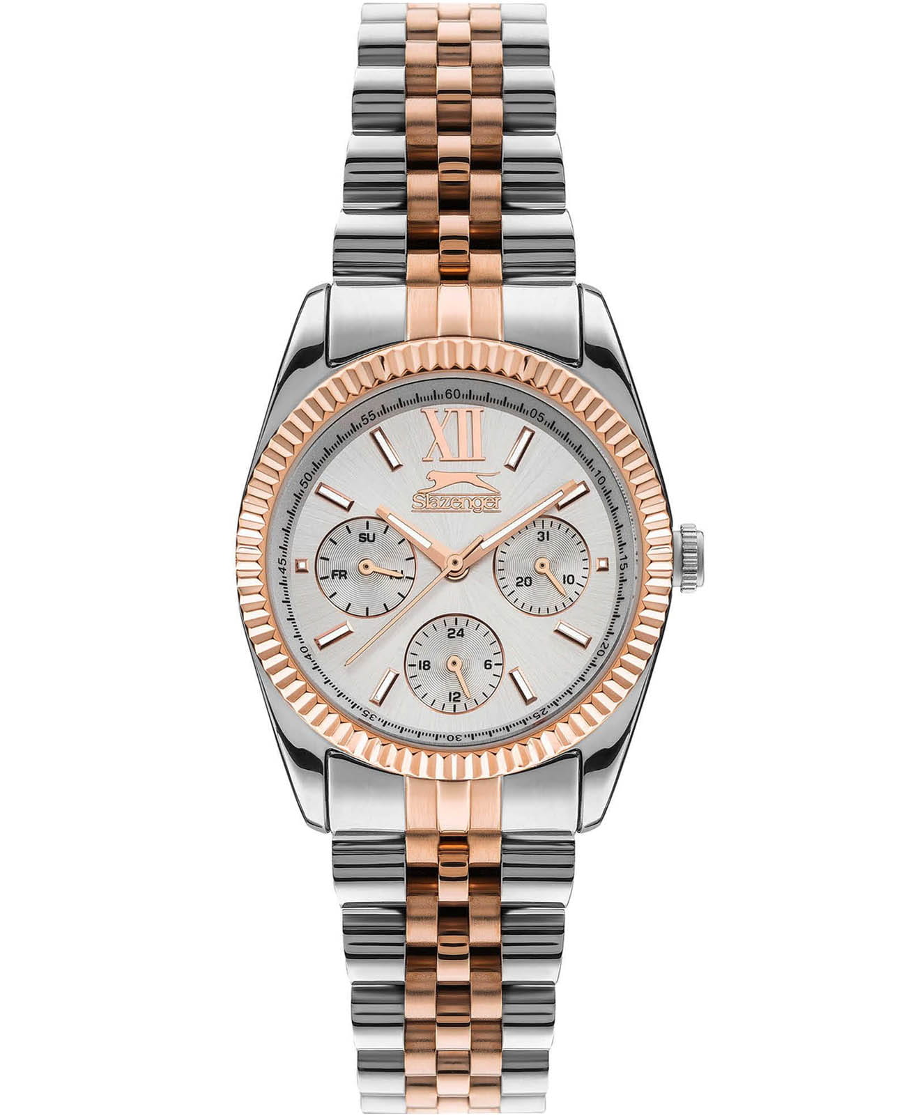 Женские элегантные наручные часы Slazenger SL.09.6556.4.04 сочетают в себе современный стиль и функциональность. Стильный корпус выполнен из суперметалла с неповортоным безелемБезельВнешний ободок, закрепляющий стекло. В спортивных часах так называется поворотное кольцо с делениями на циферблате, выполняет роль таймера – замеряет отрезки времени на шкале. Неподвижный безель – элемент декора. Однонаправленно вращающийся безель на дайверских часах позволяет фиксировать моменты погружения и выныривания на поверхность. с IP-покрытиемIP-покрытиеМетод ионного напыления. Демонстрирует повышенную устойчивость к истиранию, окислению и химическим веществам. Под воздействием высокого давления и температуры около 1500°C молекулы металла надёжно соединяются с частицами корпуса часов., придающий модели дополнительную прочность и элегантный внешний вид. Изысканный циферблат защищён минеральным стекломМинеральное стеклоМинеральное стекло представляет собой искусственно выращенный минерал кварца. Такое стекло отличается особой устойчивостью к повреждениям и царапинам. Уступает по некоторым качествам сапфировому стеклу., устойчивым к царапинам и повреждениям. Водонепроницаемость 3 АТМ позволяет использовать часы в повседневных условиях — при мытье рук или под лёгким дождём. Браслет из суперметалла с частичным IP-покрытиемIP-покрытиеМетод ионного напыления. Демонстрирует повышенную устойчивость к истиранию, окислению и химическим веществам. Под воздействием высокого давления и температуры около 1500°C молекулы металла надёжно соединяются с частицами корпуса часов. и с раскладной застёжкойРаскладная застёжкаТакой тип застёжки используется только на браслетах из металла. Она никогда не раскрывается полностью, происходит разделение на 2 и более частей. Раскладывающая застёжка снизит вероятность потери часов к минимуму., обеспечивающий надёжную фиксацию и комфорт при ношении. На отдельные циферблаты вынесены указатели 24-часового времени, даты и дня недели, что делает использование часов особенно удобным в повседневной жизни. Cтрелки и метки покрыты люминесцентным покрытиемЛюминесцентное покрытиеПозволяет считывать показания времени в темноте. Производители наносят на стрелки, часовые индексы, безель или поверхность циферблата светонакопительный состав, дающий холодное свечение. для читаемости в условиях недостаточного освещения. Эта модель идеально подходит для женщин, ценящих стиль, функциональность и надёжность в одном аксессуаре.