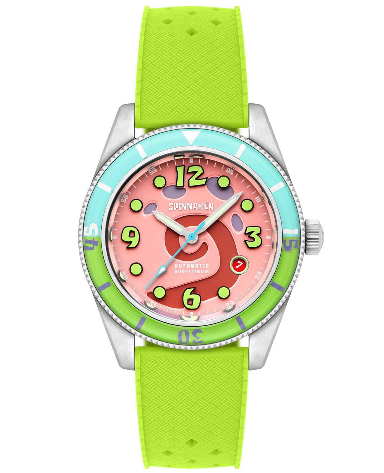Мужские механические часы с автоподзаводом Spinnaker — это лимитированный и стильный аксессуар. Корпус диаметром 43 мм выполнен из нержавеющей стали. БезельБезельВнешний ободок, закрепляющий стекло. В спортивных часах так называется поворотное кольцо с делениями на циферблате, выполняет роль таймера – замеряет отрезки времени на шкале. Неподвижный безель – элемент декора. Однонаправленно вращающийся безель на дайверских часах позволяет фиксировать моменты погружения и выныривания на поверхность. с IP-покрытиемIP-покрытиеМетод ионного напыления. Демонстрирует повышенную устойчивость к истиранию, окислению и химическим веществам. Под воздействием высокого давления и температуры около 1500°C молекулы металла надёжно соединяются с частицами корпуса часов.. Циферблат оформлен цифрами, точками и стрелками. Стрелки и метки с люминесцентным покрытиемЛюминесцентное покрытиеПозволяет считывать показания времени в темноте. Производители наносят на стрелки, часовые индексы, безель или поверхность циферблата светонакопительный состав, дающий холодное свечение., обеспечивающим хорошую читаемость в темноте. Циферблат защищён сапфировым стекломСапфировое стеклоПрочный и надёжный материал из кристалла сапфира синтетического происхождения, характеризующийся особой твёрдостью и устойчивостью к царапинам и повреждениям. с антибликовым покрытиемАнтибликовое покрытиеСлой оксида металла в 0,13-0,3 микрон, благодаря которому стекло часов не бликует и не отражает свет. Антибликовое покрытие уменьшает отражение света в 10 раз, обеспечивая отличную читаемость показателей циферблата.. Механизм — автоматический калибр Seiko NH35 (24 камня, частота 21 600 полуколебаний в час) с запасом до 41 часа. Прозрачная задняя крышка позволяет наблюдать за работой механизма. Часы оснащены зелёным силиконовым ремешком шириной 22 мм на стандартной пряжке. Водонепроницаемость 150 м позволяет использовать часы для плавания и дайвинга. Идеальный выбор для тех, кто ценит качество и нестандартный дизайн.