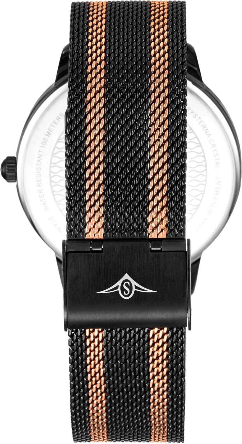 Stuhrling 3998.6 — элегантные мужские часы, объединяющие строгую классику и современную функциональность. Корпус из нержавеющей стали с PVD-покрытиемPVDУльтратонкое покрытие наносится в технике вакуумного напыления, сочетает в себе нитрид титана особой прочности со слоем золота или оксида хрома. Несёт в себе декоративную или защитную функцию. создают ощущение монолитной надёжности, а глубокий циферблат придаёт модели выразительность и характер. Стальной браслет миланского плетения с PVD-покрытиемPVDУльтратонкое покрытие наносится в технике вакуумного напыления, сочетает в себе нитрид титана особой прочности со слоем золота или оксида хрома. Несёт в себе декоративную или защитную функцию. на раскладном замкеРаскладной замокДанный вариант застежки используется только на часах с металлическим браслетом. Отличительная особенность такого крепления в том, что длина браслета становится универсальной и вы можете самостоятельно отрегулировать нужный вам размер – застежка просто двигается по браслету часов.. Прочное стекло KrysternaKrysternaKrysterna — инновационное стекло для наручных часов. Благодаря уникальной структуре, Krysterna объединяет ключевые преимущества двух материалов: твердость сапфира, защищающую от царапин, и гибкость минерального стекла, обеспечивающую устойчивость к деформациям. Такая комбинация делает его идеальным решением для часов, подверженных экстремальным нагрузкам, сохраняя при этом оптическую прозрачность. защищает циферблат от царапин, а надёжный кварцевый механизм гарантирует стабильную точность. Stuhrling — выбор уверенного мужчины, ценящего сочетание функциональности, лаконичного дизайна и безупречной отделки.