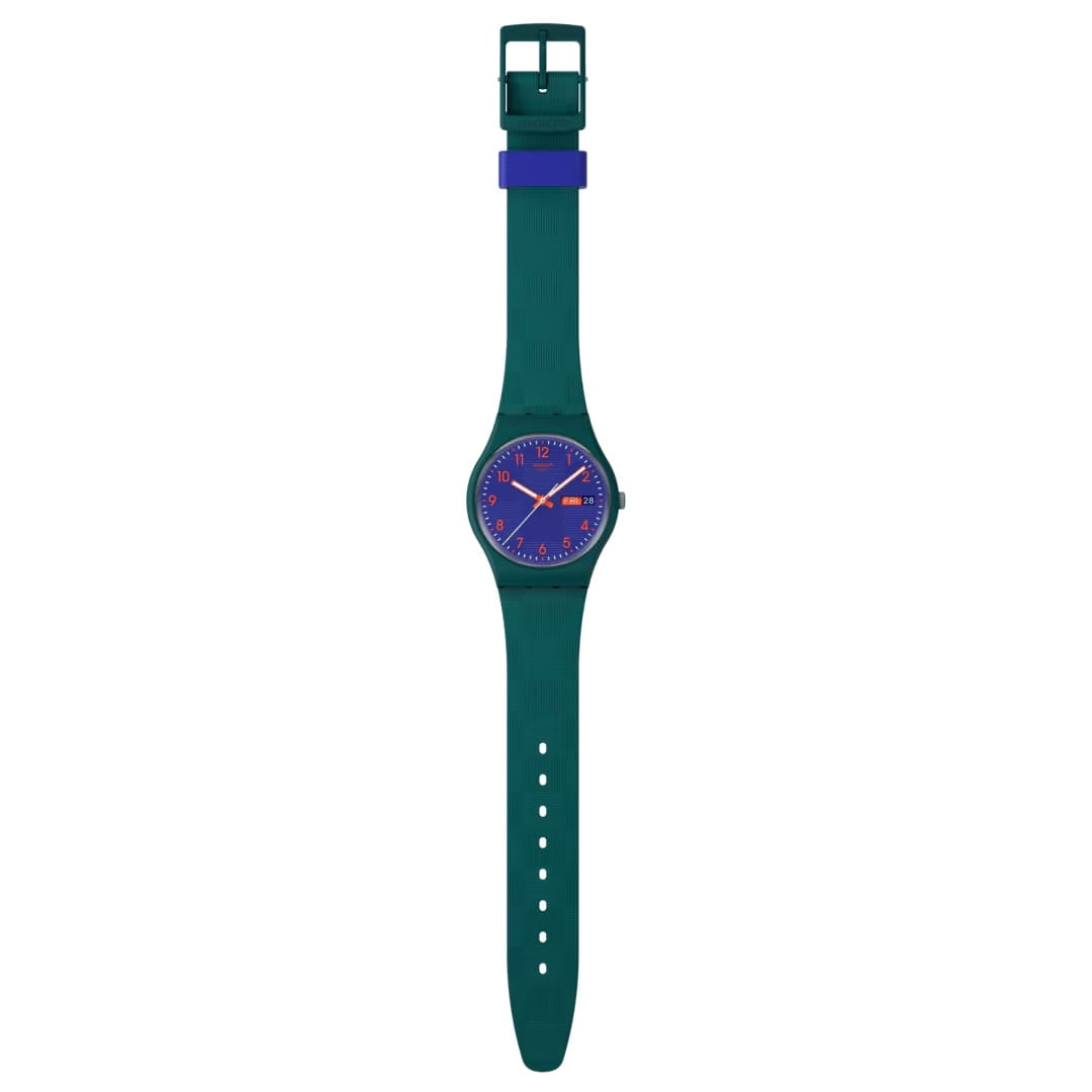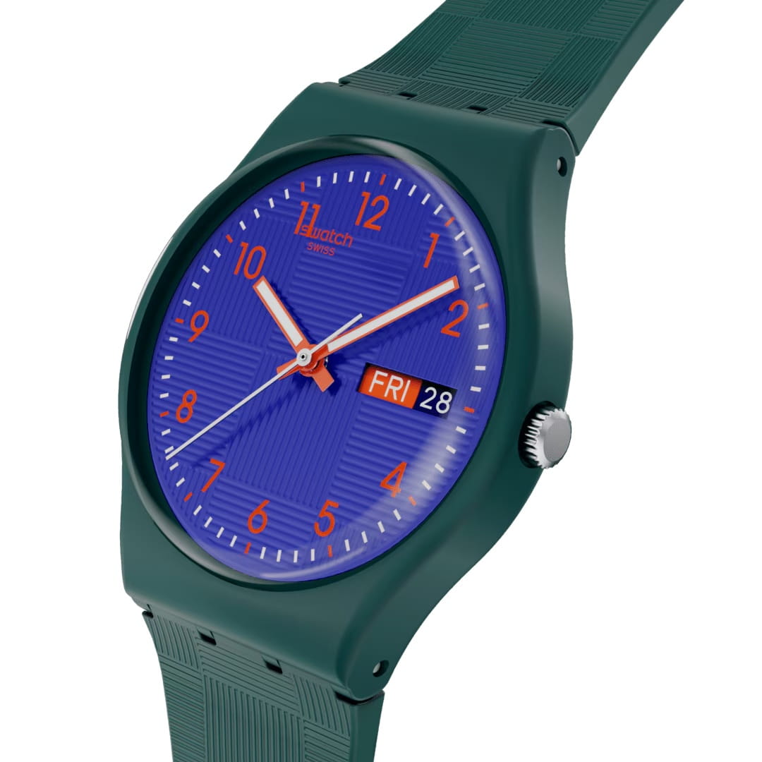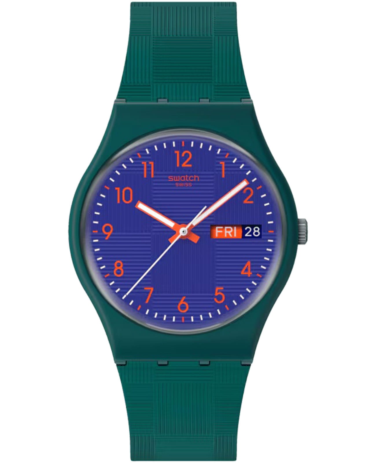 Женские наручные часы Swatch PATTERN FORMATION SO28N706 — это стильный и современный аксессуар для тех, кто ценит лёгкость и комфорт. Корпус выполнен из пластика, диаметром 34 мм и толщиной 8,75 мм, что обеспечивает долговечность и утончённый внешний вид. Циферблат защищён органическим стеклом, устойчивым к повреждениям. Модель оснащена кварцевым механизмом, обеспечивающим высокую точность хода. Часовая и минутная стрелки с люминесцентным покрытиемЛюминесцентное покрытиеПозволяет считывать показания времени в темноте. Производители наносят на стрелки, часовые индексы, безель или поверхность циферблата светонакопительный состав, дающий холодное свечение. и окошком дня недели и даты в положении «3 часа». Силиконовый текстурированный матово-зеленый ремешок на стандартной застёжке гармонично дополняет корпус и обеспечивает комфортное ношение. Водозащита 30 метров позволит защитить корпус от случайных брызг или капель дождя. Эти часы подойдут для повседневного ношения и станут ярким акцентом в вашем наряде.