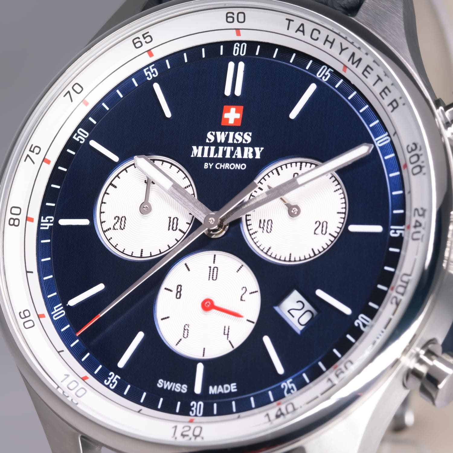 Мужские швейцарские наручные часы-хронографХронографФункция позволяет измерять отрезки времени с особой точностью: часы, минуты, секунды. Верным признаком хронографа является наличие на циферблате 3 дополнительных окошек-счётчиков. Swiss Military by Chrono SM34013.08, кварцевый механизм с высокой точностью. Класс водозащиты: 100 метров, позволит плавать, нырять и заниматься другими водными видами спорта. Стрелки с люминесцентным покрытиемЛюминесцентное покрытиеПозволяет считывать показания времени в темноте. Производители наносят на стрелки, часовые индексы, безель или поверхность циферблата светонакопительный состав, дающий холодное свечение.. Корпус часов изготовлен из стали. Минеральное стеклоМинеральное стеклоМинеральное стекло представляет собой искусственно выращенный минерал кварца. Такое стекло отличается особой устойчивостью к повреждениям и царапинам. Уступает по некоторым качествам сапфировому стеклу.. Ремешок с классической застежкой.