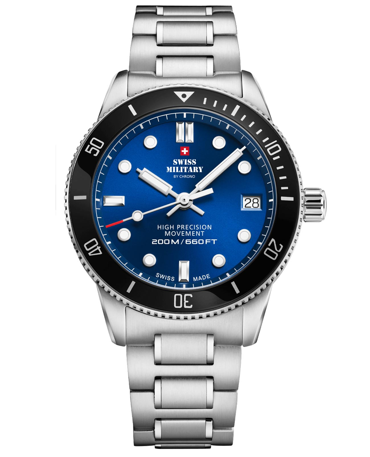 Швейцарский кварцевый механизм. Центральные часовая, минутная и секундная стрелки, окошко даты. Часы оснащены функцией EOL - индикация низкого уровня заряда батареи. Стекло K1 - уникальный материал, сочетающий в себе твёрдость сапфирового стекла и прочность минерального. На стрелки и маркеры часов нанесен светонакопительный состав. Однонаправленный поворотный безель. Завинчивающаяся заводная головка. Регулируемый по длине литой браслет из нержавеющей стали. Браслетный замок с тройным сгибом, расстегиваемый одним касанием. Часы имеют маркировку Swiss Made являющуюся гарантом, что все комплектующие и сборка часов произведены на территории Швейцарии. Право нанесения данной маркировки на наручные часы регулируется швейцарскими и международными законами.
