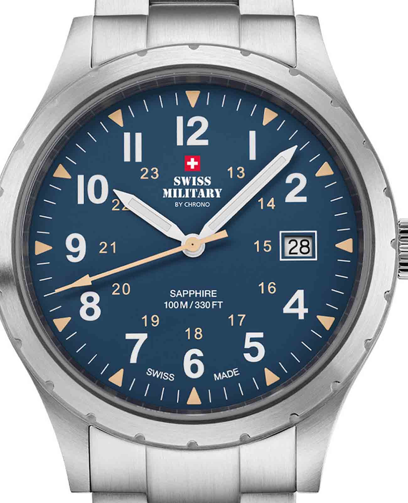Модель SM34108.03 от Swiss Military by Chrono — это надёжные швейцарские часы в классическом армейском стиле, сочетающие функциональность и сдержанный дизайн. Корпус и браслет выполнены из нержавеющей стали, подчёркивая прочность и элегантность конструкции. Циферблат с арабскими цифрами обеспечивает отличную читаемость, а функция отображения даты добавляет практичности. Часы оснащены кварцевым механизмом, обеспечивающим точный ход. Циферблат защищён сапфировым стекломСапфировое стеклоПрочный и надёжный материал из кристалла сапфира синтетического происхождения, характеризующийся особой твёрдостью и устойчивостью к царапинам и повреждениям., устойчивым к царапинам. Установлена раскладная застёжкаРаскладная застёжкаТакой тип застёжки используется только на браслетах из металла. Она никогда не раскрывается полностью, происходит разделение на 2 и более частей. Раскладывающая застёжка снизит вероятность потери часов к минимуму. для надёжной фиксации на запястье. Модель обладает водонепроницаемостью до 100 метров, что делает её подходящей для плавания и сноркелинга.