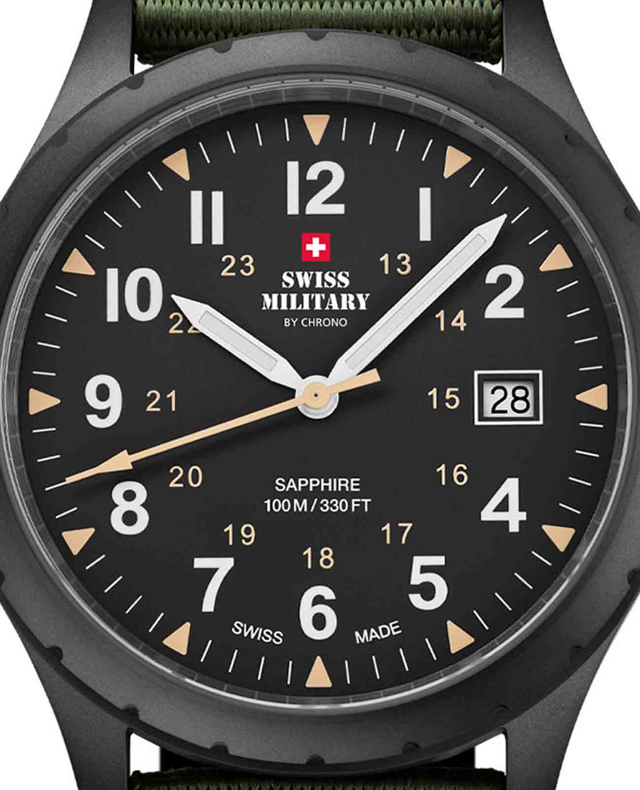 Модель SM34108.07 от Swiss Military by Chrono — это надёжные швейцарские часы в классическом армейском стиле, сочетающие функциональность и сдержанный дизайн. Корпус выполнен из нержавеющей стали с PVD-покрытиемPVDУльтратонкое покрытие наносится в технике вакуумного напыления, сочетает в себе нитрид титана особой прочности со слоем золота или оксида хрома. Несёт в себе декоративную или защитную функцию., подчёркивая прочность и элегантность конструкции. Циферблат с арабскими цифрами обеспечивает отличную читаемость, а функция отображения даты добавляет практичности. Часы оснащены кварцевым механизмом, обеспечивающим точный ход. Циферблат защищён сапфировым стекломСапфировое стеклоПрочный и надёжный материал из кристалла сапфира синтетического происхождения, характеризующийся особой твёрдостью и устойчивостью к царапинам и повреждениям., устойчивым к царапинам. Тканевый ремешок на стандартной застежке для надёжной фиксации на запястье. Модель обладает водонепроницаемостью до 100 метров, что делает её подходящей для плавания и сноркелинга.