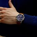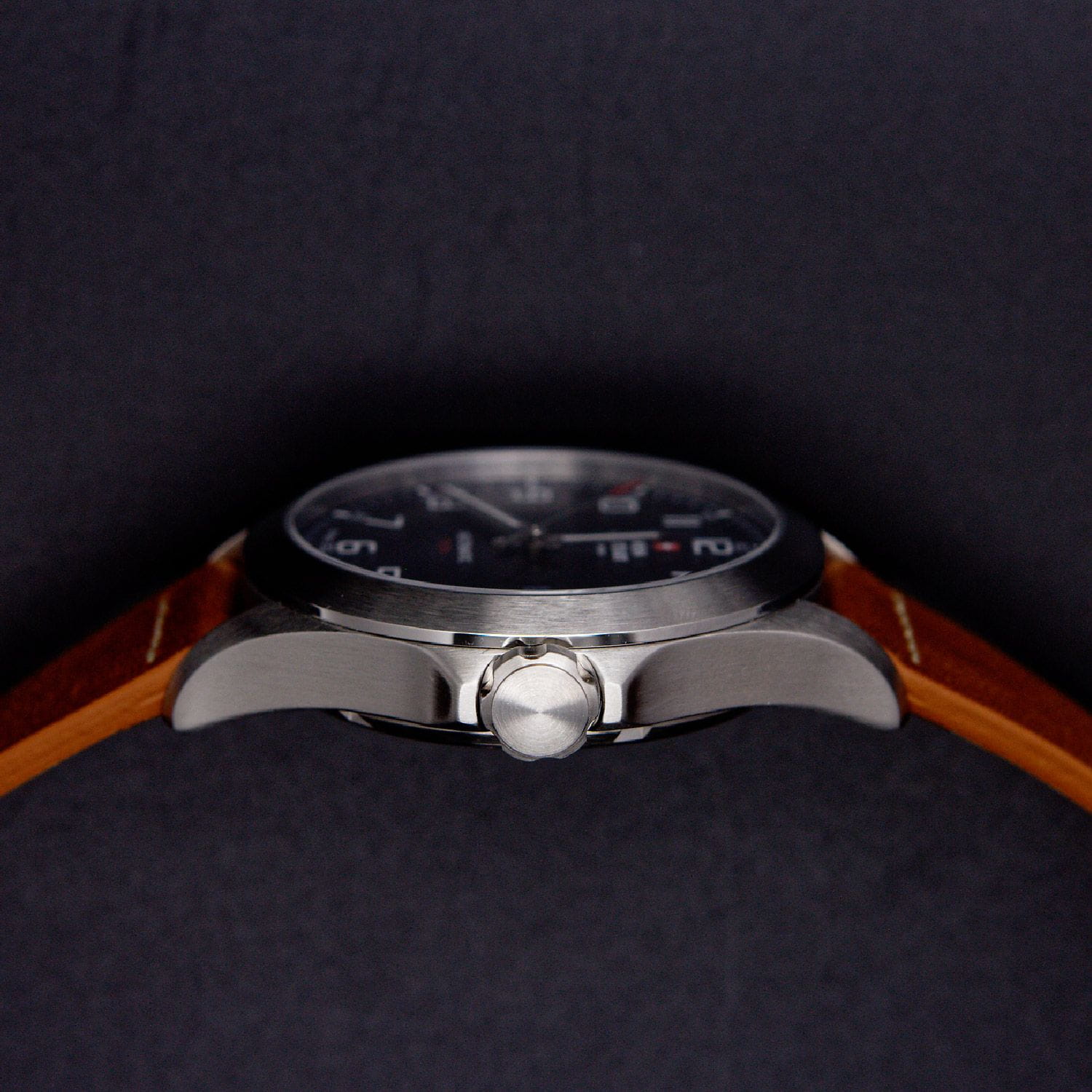 Мужские швейцарские механические часы с автоподзаводом Swiss Military by Chrono Automatic Collection SMA34077.03, механический механизм (автоматический калибр) с высокой точностью. Сапфировое стеклоСапфировое стеклоПрочный и надёжный материал из кристалла сапфира синтетического происхождения, характеризующийся особой твёрдостью и устойчивостью к царапинам и повреждениям. устойчивое к появлению царапин, обладающее высокой прозрачностью. Класс водозащиты: 100 метров, позволит плавать, нырять и заниматься другими водными видами спорта. Корпус часов изготовлен из нержавеющей стали серебристого цвета. На синем циферблате центральные часовая, минутная и секундная стрелки и индикация даты на позиции трех часов. Стрелки с люминесцентной подсветкойЛюминесцентное покрытиеПозволяет считывать показания времени в темноте. Производители наносят на стрелки, часовые индексы, безель или поверхность циферблата светонакопительный состав, дающий холодное свечение.. Часовые индексы в виде штрихов и цифр. Заводная головка с защитой. Кожаный ремешок коричневого цвета.