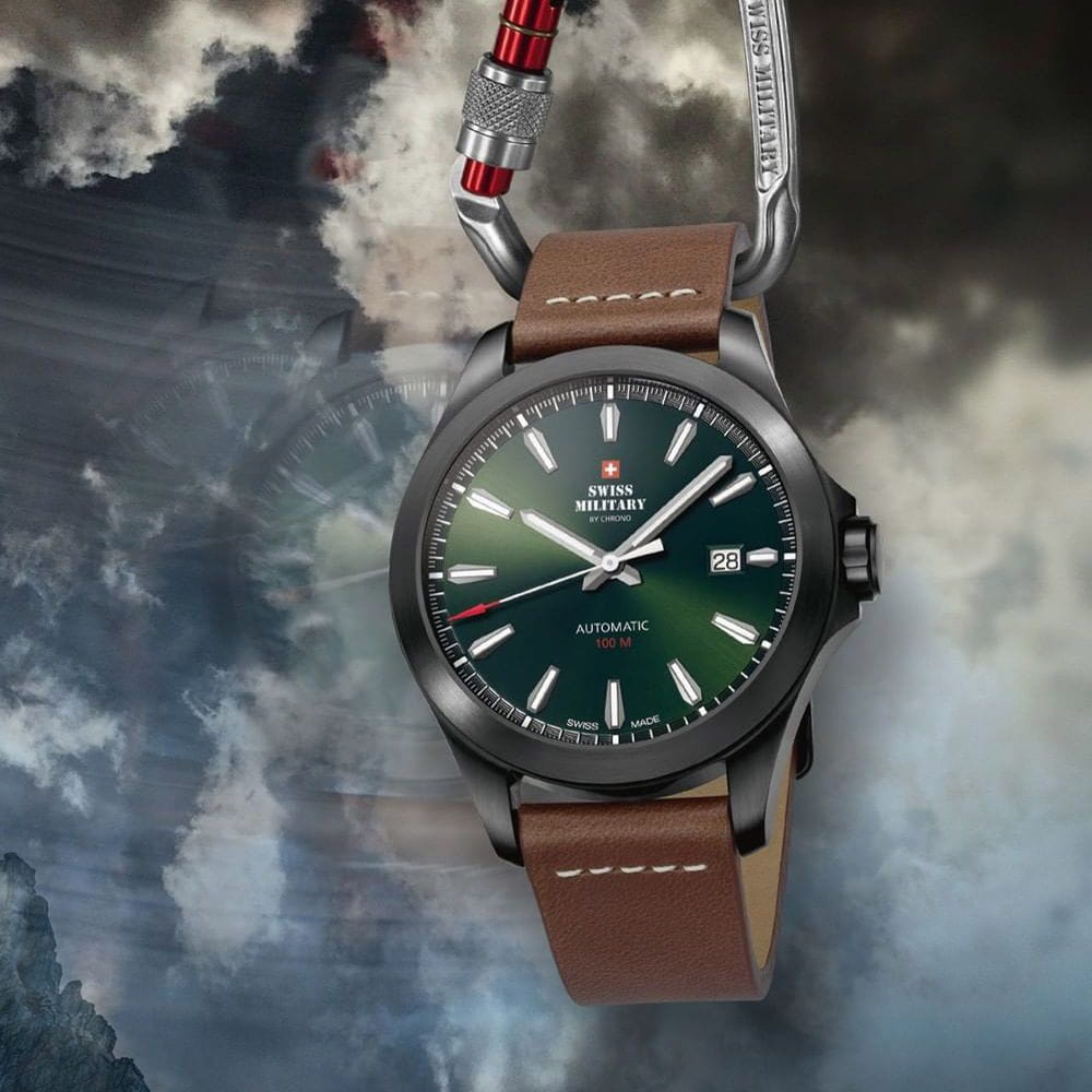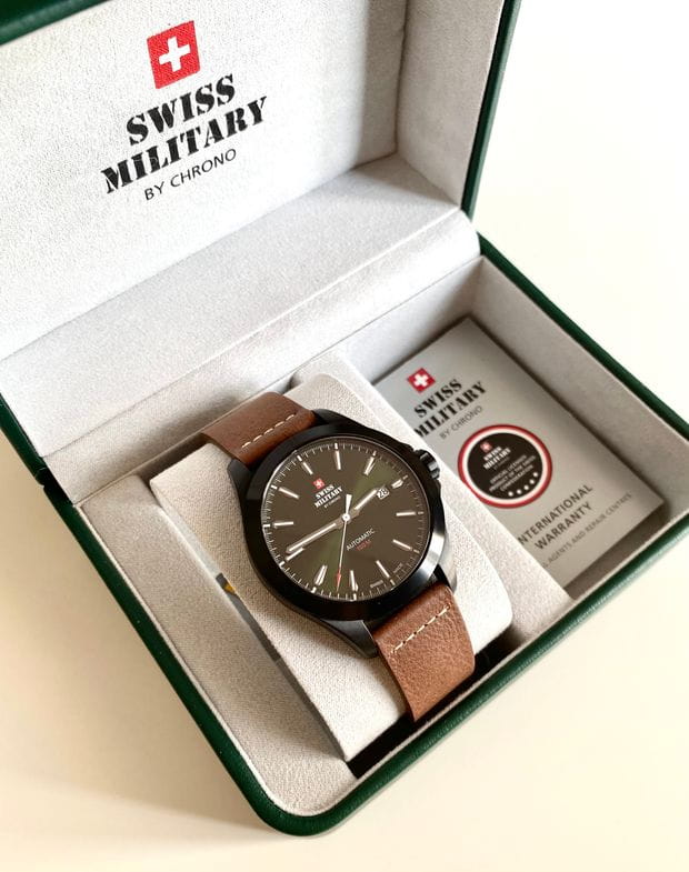 Мужские швейцарские механические часы с автоподзаводом Swiss Military by Chrono Automatic Collection SMA34077.12, механический механизм (автоматический калибр) с высокой точностью. Сапфировое стеклоСапфировое стеклоПрочный и надёжный материал из кристалла сапфира синтетического происхождения, характеризующийся особой твёрдостью и устойчивостью к царапинам и повреждениям. устойчивое к появлению царапин, обладающее высокой прозрачностью. Класс водозащиты: 100 метров, позволит плавать, нырять и заниматься другими водными видами спорта. Корпус часов изготовлен из матовой стали с PVDPVDУльтратонкое покрытие наносится в технике вакуумного напыления, сочетает в себе нитрид титана особой прочности со слоем золота или оксида хрома. Несёт в себе декоративную или защитную функцию. покрытием черного цвета. Апертура даты в позиции 3 часов. Коричневый кожаный ремешок с классической пряжкой.