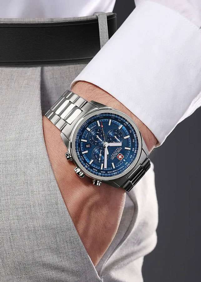 Мужские швейцарские часы Swiss Military Hanowa SMWGI0004205 – это элегантные часы, сочетающие в себе классический дизайн и современную функциональность. Корпус из нержавеющей стали диаметром 43 мм сбалансирован и элегантен. Сапфировое стеклоСапфировое стеклоПрочный и надёжный материал из кристалла сапфира синтетического происхождения, характеризующийся особой твёрдостью и устойчивостью к царапинам и повреждениям. с антибликовым покрытием защищает циферблат от царапин и обеспечивает отличную читаемость при любом освещении. Браслет с раскладной застёжкойРаскладная застёжкаТакой тип застёжки используется только на браслетах из металла. Она никогда не раскрывается полностью, происходит разделение на 2 и более частей. Раскладывающая застёжка снизит вероятность потери часов к минимуму. идеально дополняют дизайн часов, обеспечивая комфортное ношение. Люминесцентное покрытиеЛюминесцентное покрытиеПозволяет считывать показания времени в темноте. Производители наносят на стрелки, часовые индексы, безель или поверхность циферблата светонакопительный состав, дающий холодное свечение. стрелок и меток позволит вам следить за временем даже в полной темноте. Циферблат с точным механизмом хронографаХронографФункция позволяет измерять отрезки времени с особой точностью: часы, минуты, секунды. Верным признаком хронографа является наличие на циферблате 3 дополнительных окошек-счётчиков. и хорошо заметным индикатором даты в положении между 4 и 5 часов. ТахиметрТахиметрРазмеченная шкала, располагается на ободке или безеле часов. Тахиметр позволяет рассчитать скорость на определённом участке пути, расстояние измеряется в километрах или милях. по внешнему краю. Водонепроницаемость до 100 метров хорошо подходят для повседневного ношения и занятий водными видами спорта.