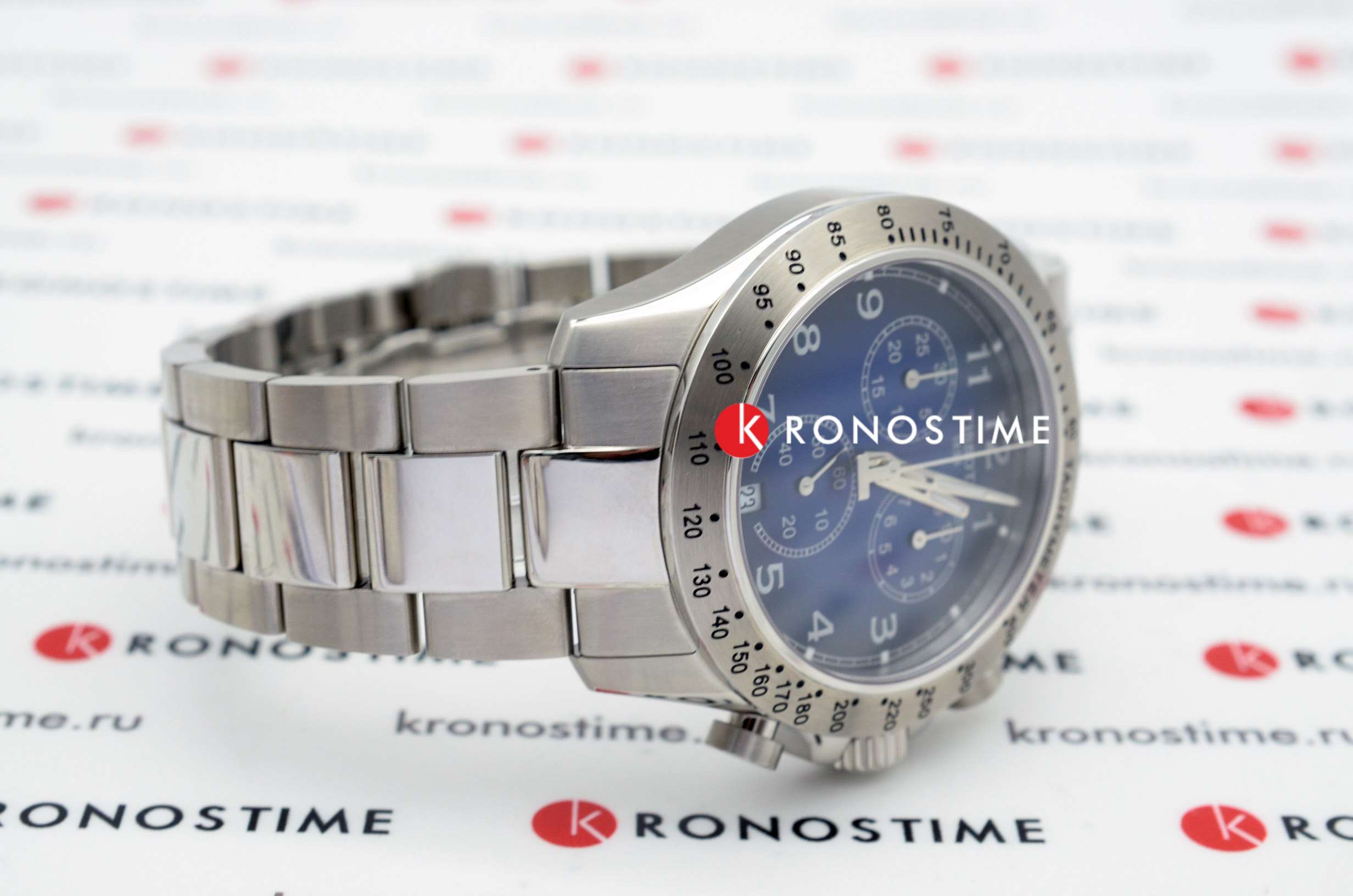 Сдержанный тёмно-синий циферблат со счётчиками хронографаХронографФункция позволяет измерять отрезки времени с особой точностью: часы, минуты, секунды. Верным признаком хронографа является наличие на циферблате 3 дополнительных окошек-счётчиков. акцентирует всё внимание на себе. Стрелки имеют люминесцентную подсветкуЛюминесцентное покрытиеПозволяет считывать показания времени в темноте. Производители наносят на стрелки, часовые индексы, безель или поверхность циферблата светонакопительный состав, дающий холодное свечение., чтобы использование часов в темноте не вызывало затруднений. Привлекательный внешний вид. Кварцевый механизм ETA G10.212. Хирургическая сталь устойчива к повреждениям и ударам. Водозащита до 10 бар. . Секундомер, тахиметрТахиметрРазмеченная шкала, располагается на ободке или безеле часов. Тахиметр позволяет рассчитать скорость на определённом участке пути, расстояние измеряется в километрах или милях., календарь. Габариты: 42,5 x 42,5 x 11,2 мм.