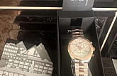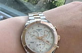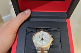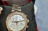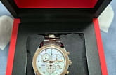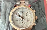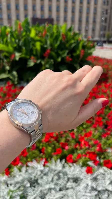 Швейцарские наручные часы имеют перламутровый циферблат, инкрустированный бриллиантами, драгоценные камни используются вместо меток часов. Корпус и центральные звенья браслета имеют PVD-покрытие цвета розового золота, оно характеризуется долговечностью и устойчивостью к царапинам. Кварцевый механизм ETA G15.212. Водонепроницаемость 100 метров. Хронограф, секундомер, апертура даты. Габариты: 38 x 38 x 10,5 мм.