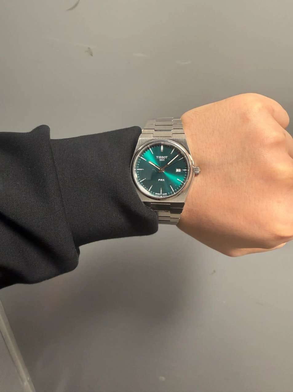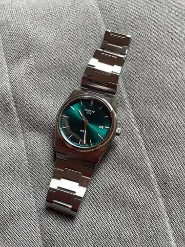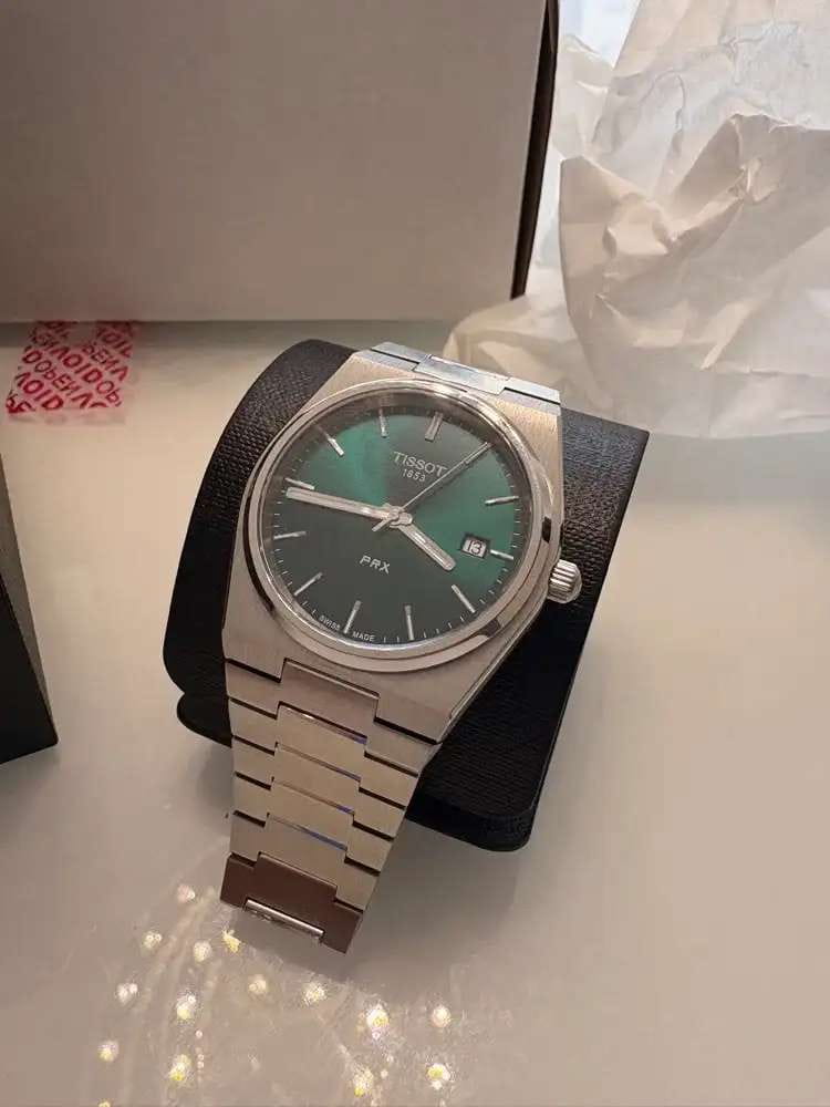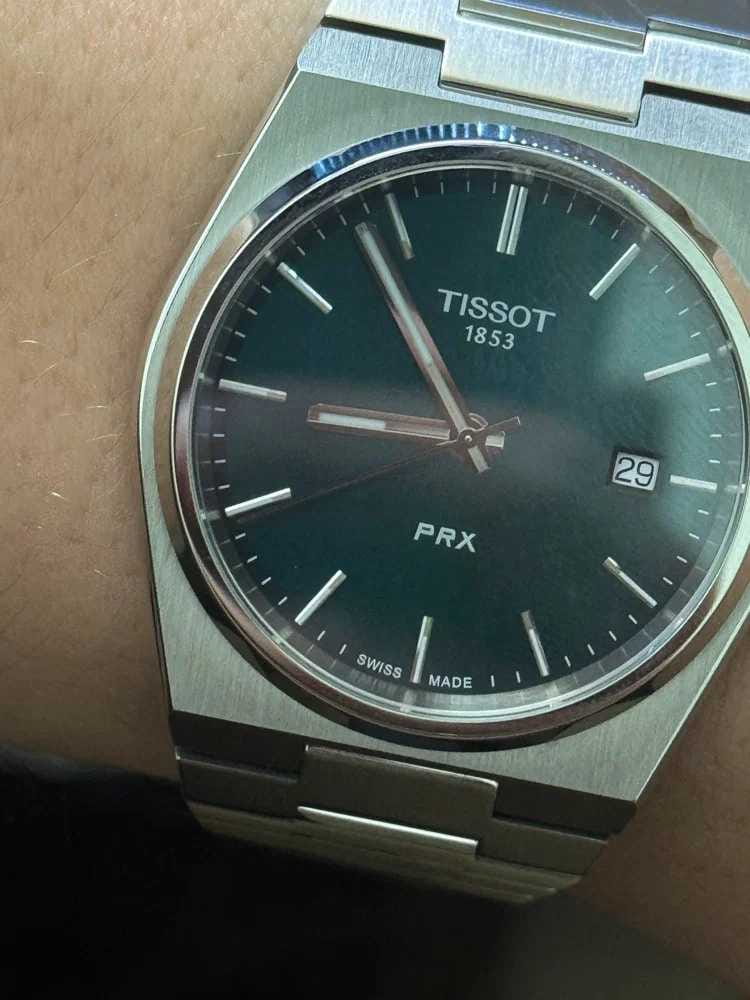 Tissot PRX 40mm (модель T137.410.11.091.00) – элегантные мужские часы, сочетающие современный стиль с передовыми технологиями. Корпус диаметром 40 мм выполнен из нержавеющей стали 316L, что обеспечивает надёжность и долговечность. Зелёный циферблат с эффектом солнечных лучей защищён сапфировым стекломСапфировое стеклоПрочный и надёжный материал из кристалла сапфира синтетического происхождения, характеризующийся особой твёрдостью и устойчивостью к царапинам и повреждениям., устойчивым к царапинам.