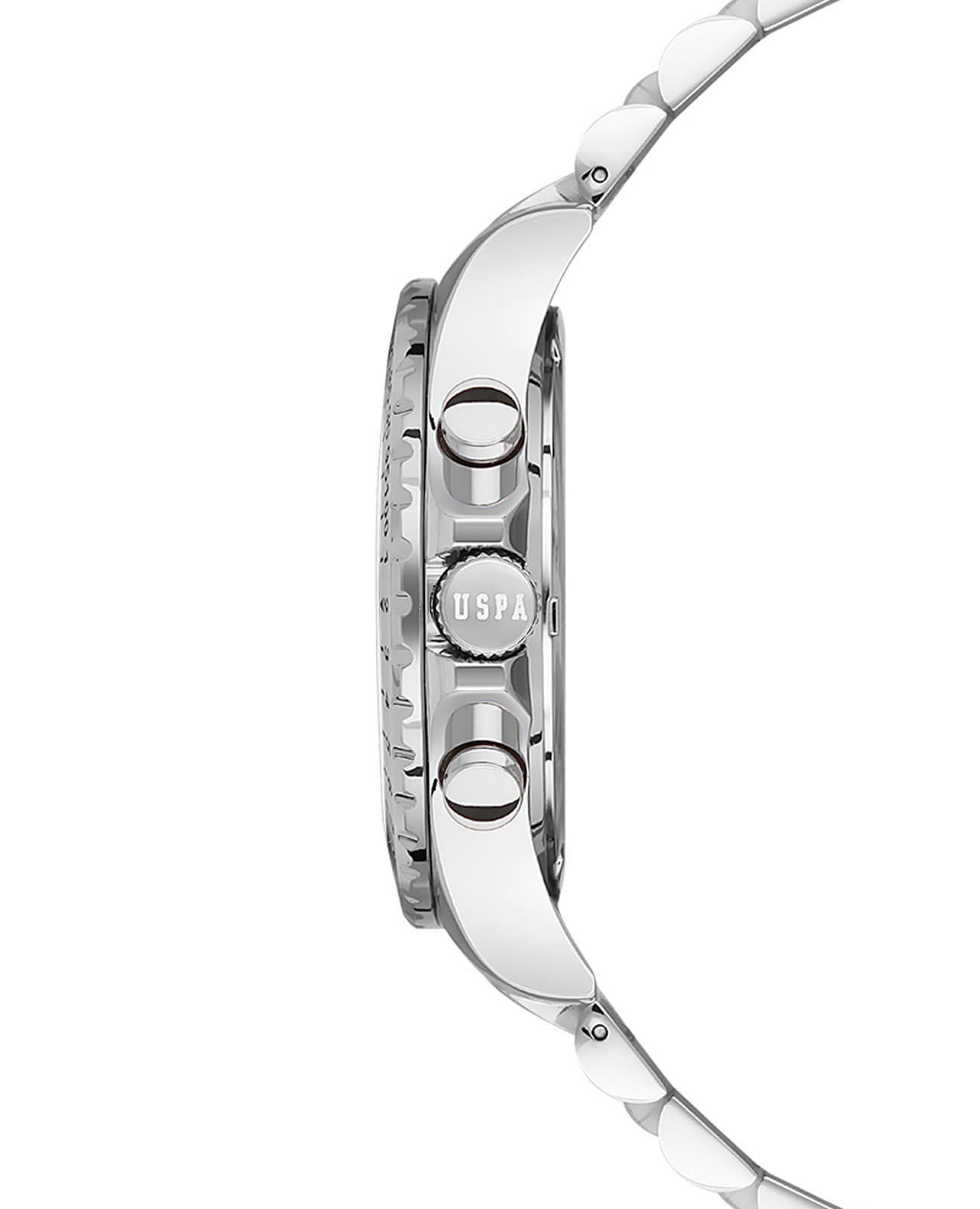 Мужские часы U.S. Polo Assn. Crossing USPA1052-01, кварцевый механизм с высокой точностью. Минеральное стеклоМинеральное стеклоМинеральное стекло представляет собой искусственно выращенный минерал кварца. Такое стекло отличается особой устойчивостью к повреждениям и царапинам. Уступает по некоторым качествам сапфировому стеклу. устойчивое к появлению царапин, обладающее высокой прозрачностью. Корпус изготовлен из нержавеющей стали. Центральные часовая, минутная и секундная стрелки. Индикация даты и дня недели. Второй часовой пояс в 24х часовом формате. Стрелки и метки с люминесцентным покрытиемЛюминесцентное покрытиеПозволяет считывать показания времени в темноте. Производители наносят на стрелки, часовые индексы, безель или поверхность циферблата светонакопительный состав, дающий холодное свечение.. Окошко даты находится в положении между 4 и 5 часами. Класс водозащиты: 50 метров, позволит защитить корпус от случайных брызг или капель дождя. Стальной браслет на застёжке-бабочкеЗастёжка "бабочка"Такой вид застёжки дополняется предохранителями, помогающими избежать случайного раскрытия браслета. Обладают изящным исполнением. .