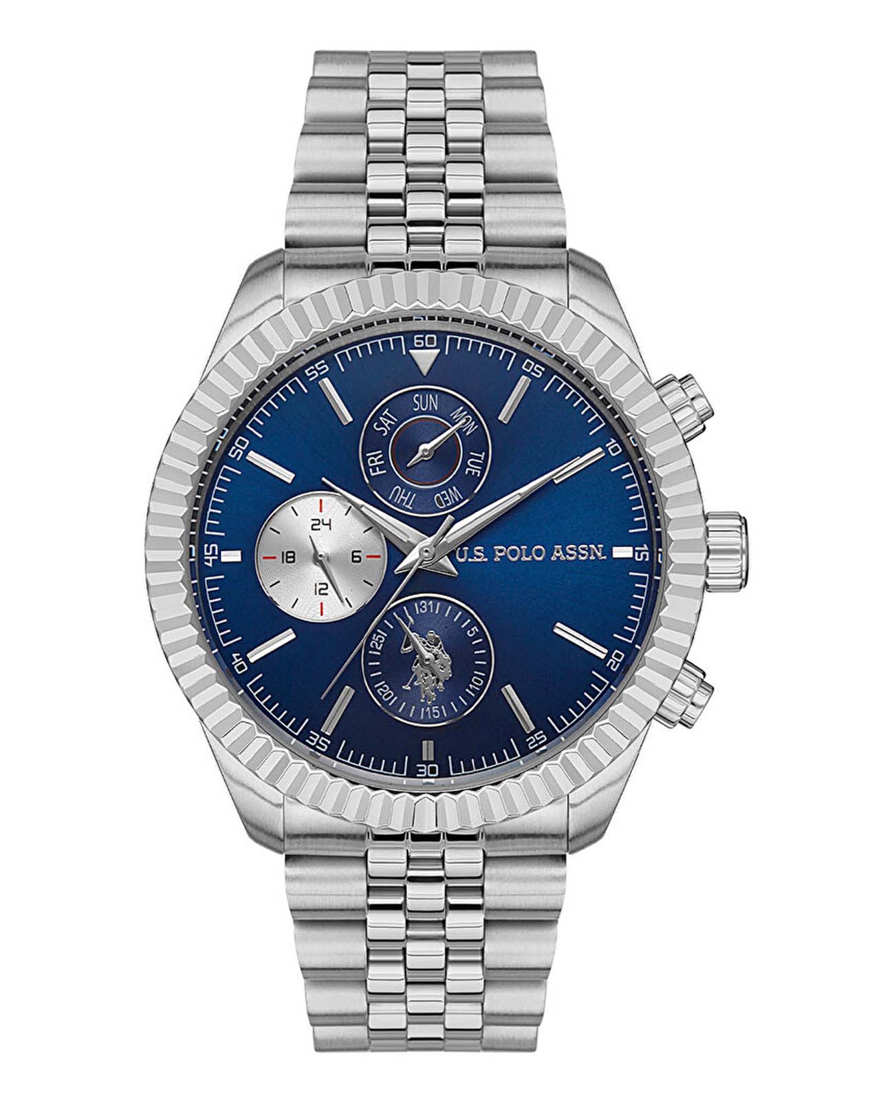 Мужские часы U.S. Polo Assn. Crossing USPA1054-03, кварцевый механизм с высокой точностью. Минеральное стеклоМинеральное стеклоМинеральное стекло представляет собой искусственно выращенный минерал кварца. Такое стекло отличается особой устойчивостью к повреждениям и царапинам. Уступает по некоторым качествам сапфировому стеклу. устойчивое к появлению царапин, обладающее высокой прозрачностью. Корпус изготовлен из нержавеющей стали. Центральные часовая, минутная и секундная стрелки. Индикация даты и дня недели. 12/24х часовой формат времени. Стрелки с люминесцентным покрытиемЛюминесцентное покрытиеПозволяет считывать показания времени в темноте. Производители наносят на стрелки, часовые индексы, безель или поверхность циферблата светонакопительный состав, дающий холодное свечение.. Класс водозащиты: 50 метров, позволит защитить корпус от случайных брызг или капель дождя. Стальной браслет на раскладной застёжкеРаскладная застёжкаТакой тип застёжки используется только на браслетах из металла. Она никогда не раскрывается полностью, происходит разделение на 2 и более частей. Раскладывающая застёжка снизит вероятность потери часов к минимуму..