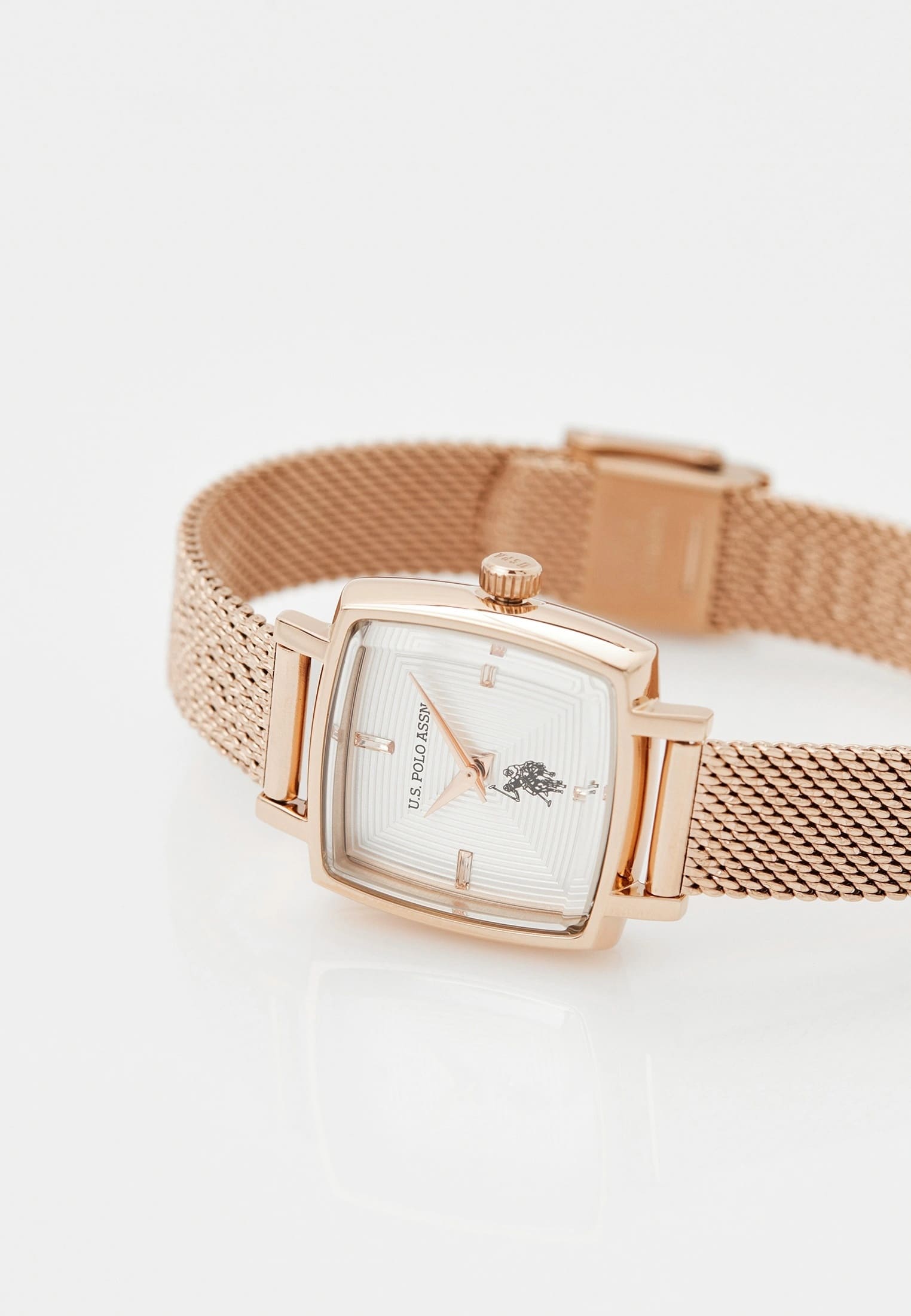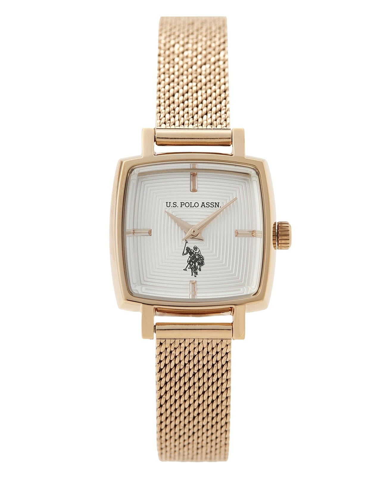 Женские наручные часы U.S. Polo Assn. Stile USPA2066-03 — это стильный и лаконичный аксессуар, выполненный в форме квадрата. Модель изготовлена из стали с PVD-покрытиемPVDУльтратонкое покрытие наносится в технике вакуумного напыления, сочетает в себе нитрид титана особой прочности со слоем золота или оксида хрома. Несёт в себе декоративную или защитную функцию. цвета розового золота, что придаёт ей благородный внешний вид и устойчивость к царапинам. Циферблат белого цвета дополнен секундной стрелкой, обеспечивающей точность отсчёта времени. Защиту циферблата обеспечивает минеральное стеклоМинеральное стеклоМинеральное стекло представляет собой искусственно выращенный минерал кварца. Такое стекло отличается особой устойчивостью к повреждениям и царапинам. Уступает по некоторым качествам сапфировому стеклу., устойчивое к мелким повреждениям. Часы оснащены кварцевым механизмом, гарантирующим точность и минимальное обслуживание. Водонепроницаемость 3 АТМ позволяет использовать часы в повседневных условиях — при мытье рук или под лёгким дождём. Браслет выполнен в технике миланской сетки из стали с покрытием розового золота и оснащён раскладным замкомРаскладной замокДанный вариант застежки используется только на часах с металлическим браслетом. Отличительная особенность такого крепления в том, что длина браслета становится универсальной и вы можете самостоятельно отрегулировать нужный вам размер – застежка просто двигается по браслету часов., обеспечивающей комфорт и уверенную фиксацию на запястье. Толщина корпуса составляет 10 мм, а его размеры — 26x26 мм, что делает часы компактными и удобными в носке. Эти часы станут универсальным аксессуаром для уверенных в себе женщин, которые ценят сочетание стиля, качества и эстетики — идеальный выбор для повседневного образа и торжественных случаев.