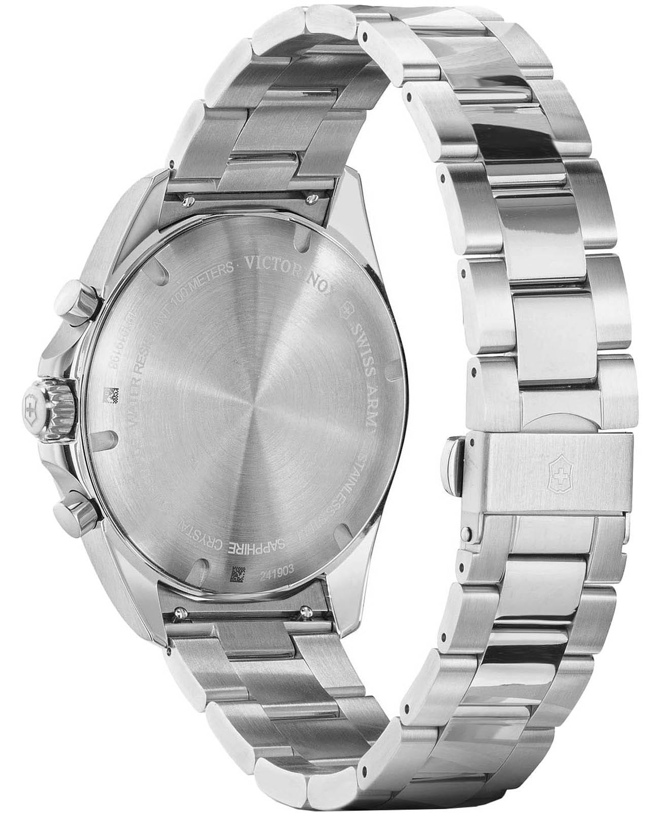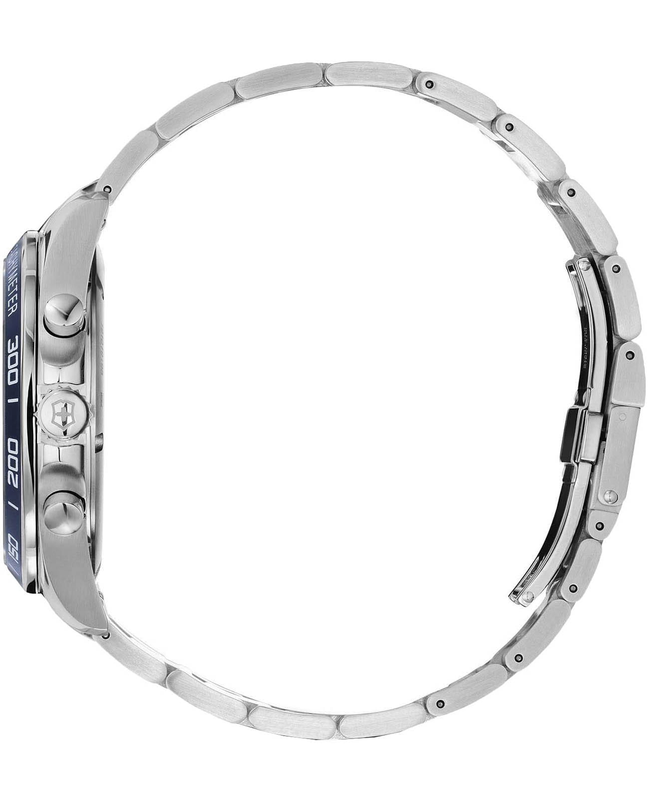 Мужские швейцарские часы-хронографХронографФункция позволяет измерять отрезки времени с особой точностью: часы, минуты, секунды. Верным признаком хронографа является наличие на циферблате 3 дополнительных окошек-счётчиков. Victorinox Fieldforce Chronograph 241901 с надёжным кварцевым механизмом. Сапфировое стеклоСапфировое стеклоПрочный и надёжный материал из кристалла сапфира синтетического происхождения, характеризующийся особой твёрдостью и устойчивостью к царапинам и повреждениям. с трёхслойным антибликовым покрытием. Корпус часов выполнен из нержавеющей стали 316L. Стальной браслет на раскладной застёжкеРаскладная застёжкаТакой тип застёжки используется только на браслетах из металла. Она никогда не раскрывается полностью, происходит разделение на 2 и более частей. Раскладывающая застёжка снизит вероятность потери часов к минимуму.. Влагозащита: 100 метров, позволит плавать, нырять и заниматься другими водными видами спорта. Окошко даты находится в положении 6 часов, стрелки и метки с люминесцентным покрытиемЛюминесцентное покрытиеПозволяет считывать показания времени в темноте. Производители наносят на стрелки, часовые индексы, безель или поверхность циферблата светонакопительный состав, дающий холодное свечение., тахиметрТахиметрРазмеченная шкала, располагается на ободке или безеле часов. Тахиметр позволяет рассчитать скорость на определённом участке пути, расстояние измеряется в километрах или милях..