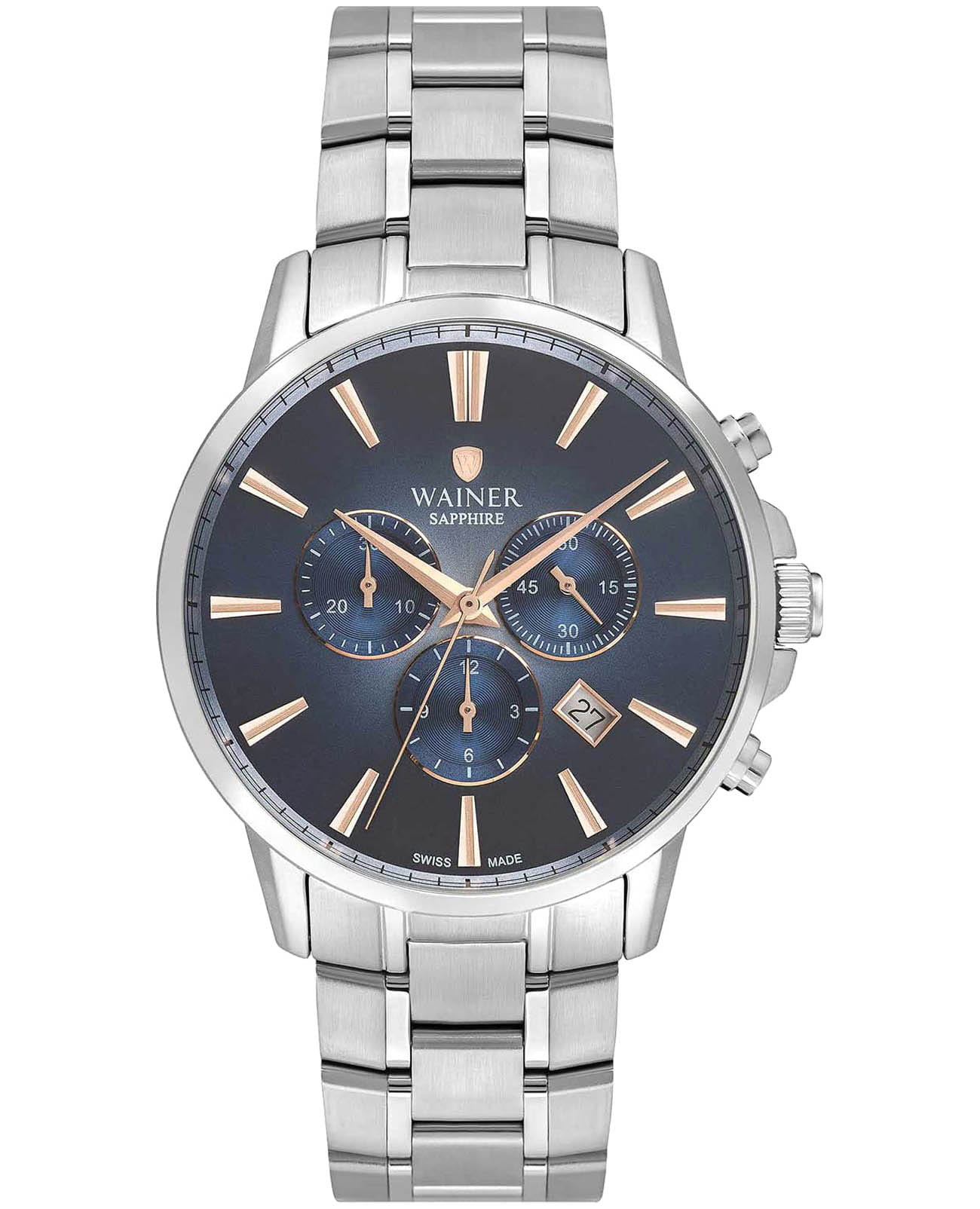 Мужские кварцевые часы-хронографХронографФункция позволяет измерять отрезки времени с особой точностью: часы, минуты, секунды. Верным признаком хронографа является наличие на циферблате 3 дополнительных окошек-счётчиков. с секундомеромСекундомерСекундоме́р — прибор, способный измерять интервалы времени с точностью до долей секунды. Wainer WA.19333-A сочетает элегантный дизайн и высокое качество исполнения. Корпус выполнен из нержавеющей стали 316L серебристого цвета, диаметром 44 мм и толщиной 10 мм, обеспечивает прочность и долговечность. Циферблат с метками в виде штрихов и украшен фирменным логотипом Wainer. Сапфировое стеклоСапфировое стеклоПрочный и надёжный материал из кристалла сапфира синтетического происхождения, характеризующийся особой твёрдостью и устойчивостью к царапинам и повреждениям. защищает дисплей от царапин и механических повреждений. Окошко даты находится в положении между отметками 4 и 5 часов. Стальной браслет на застёжке-бабочкеЗастёжка "бабочка"Такой вид застёжки дополняется предохранителями, помогающими избежать случайного раскрытия браслета. Обладают изящным исполнением. обеспечивает комфортное ношение. Водонепроницаемость до 50 метров позволит защитить корпус от случайных брызг или капель дождя. Рифленая заводная головка с защитой. Wainer — это стильный и надежный аксессуар для тех, кто ценит швейцарское качество и современные технологии.
