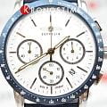 Мужские наручные часы-хронографХронографФункция позволяет измерять отрезки времени с особой точностью: часы, минуты, секунды. Верным признаком хронографа является наличие на циферблате 3 дополнительных окошек-счётчиков. Zeppelin New York 88781 сочетают в себе классический дизайн и надежность современных технологий. Модель обладает круглым корпусом диаметром 42 мм, изготовленным из нержавеющей стали, что обеспечивает высокую устойчивость к внешним воздействиям. БезельБезельВнешний ободок, закрепляющий стекло. В спортивных часах так называется поворотное кольцо с делениями на циферблате, выполняет роль таймера – замеряет отрезки времени на шкале. Неподвижный безель – элемент декора. Однонаправленно вращающийся безель на дайверских часах позволяет фиксировать моменты погружения и выныривания на поверхность. с IP-покрытиемIP-покрытиеМетод ионного напыления. Демонстрирует повышенную устойчивость к истиранию, окислению и химическим веществам. Под воздействием высокого давления и температуры около 1500°C молекулы металла надёжно соединяются с частицами корпуса часов.. Браслет выполнен из натуральной кожи с классической застежкой, гарантирующей комфортное ношение и стильный внешний вид. Белый циферблат оснащен шкалой тахиметраТахиметрРазмеченная шкала, располагается на ободке или безеле часов. Тахиметр позволяет рассчитать скорость на определённом участке пути, расстояние измеряется в километрах или милях., малыми циферблатами для функций хронографа, а также окном даты. Для защиты используется минеральное стеклоМинеральное стеклоМинеральное стекло представляет собой искусственно выращенный минерал кварца. Такое стекло отличается особой устойчивостью к повреждениям и царапинам. Уступает по некоторым качествам сапфировому стеклу. с антибликовым покрытиемАнтибликовое покрытиеСлой оксида металла в 0,13-0,3 микрон, благодаря которому стекло часов не бликует и не отражает свет. Антибликовое покрытие уменьшает отражение света в 10 раз, обеспечивая отличную читаемость показателей циферблата., обеспечивающее прочную защиту от царапин и оптимальную видимость циферблата даже при ярком свете. Часы работают на кварцевом механизме, который гарантирует точное время без необходимости подзаводки. Водонепроницаемость часов достигает 5 атмосфер (50 метров), что позволяет использовать их в повседневной жизни, однако не рекомендуется для плавания или дайвинга.